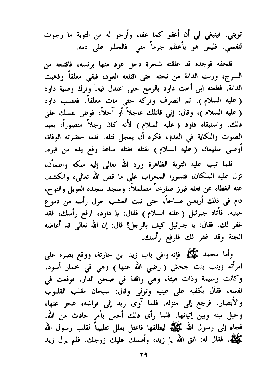 وَأما مُحَمَّد صلى الله عَلَيْهِ وَسلم فَإِنَّهُ وافى بَاب زيد بن حَارِثَة وَوَقع بَصَره على امْرَأَته زَيْنَب بنت جحش رَضِي الله عَنْهَا وَهِي فِي خمار أسود وَكَانَت وسيمة وَذَات هَيْئَة وَهِي واقفة فِي صحن الدَّار فَوَقَعت فِي نَفسه فَقَالَ بكفيه على عَيْنَيْهِ وَتَوَلَّى وَقَالَ سُبْحَانَ مُقَلِّب الْقُلُوب والأبصار فَرجع إِلَى منزله فَلَمَّا آوى زيد إِلَى فرَاشه عجز عَنْهَا وحيل بَينه وَبَين إتيانها فَلَمَّا رأى ذَلِك أحس بِأَمْر حَادث من الله فجَاء إِلَى رَسُول الله صلى الله عَلَيْهِ وَسلم ليُطَلِّقهَا فاعتل بعلل تطييبا لقلب رَسُول الله صلى الله عَلَيْهِ وَسلم فَقَالَ لَهُ (اتَّقِ الله يَا زيد وَأمْسك عَلَيْك زَوجك) فَلم يزل زيد