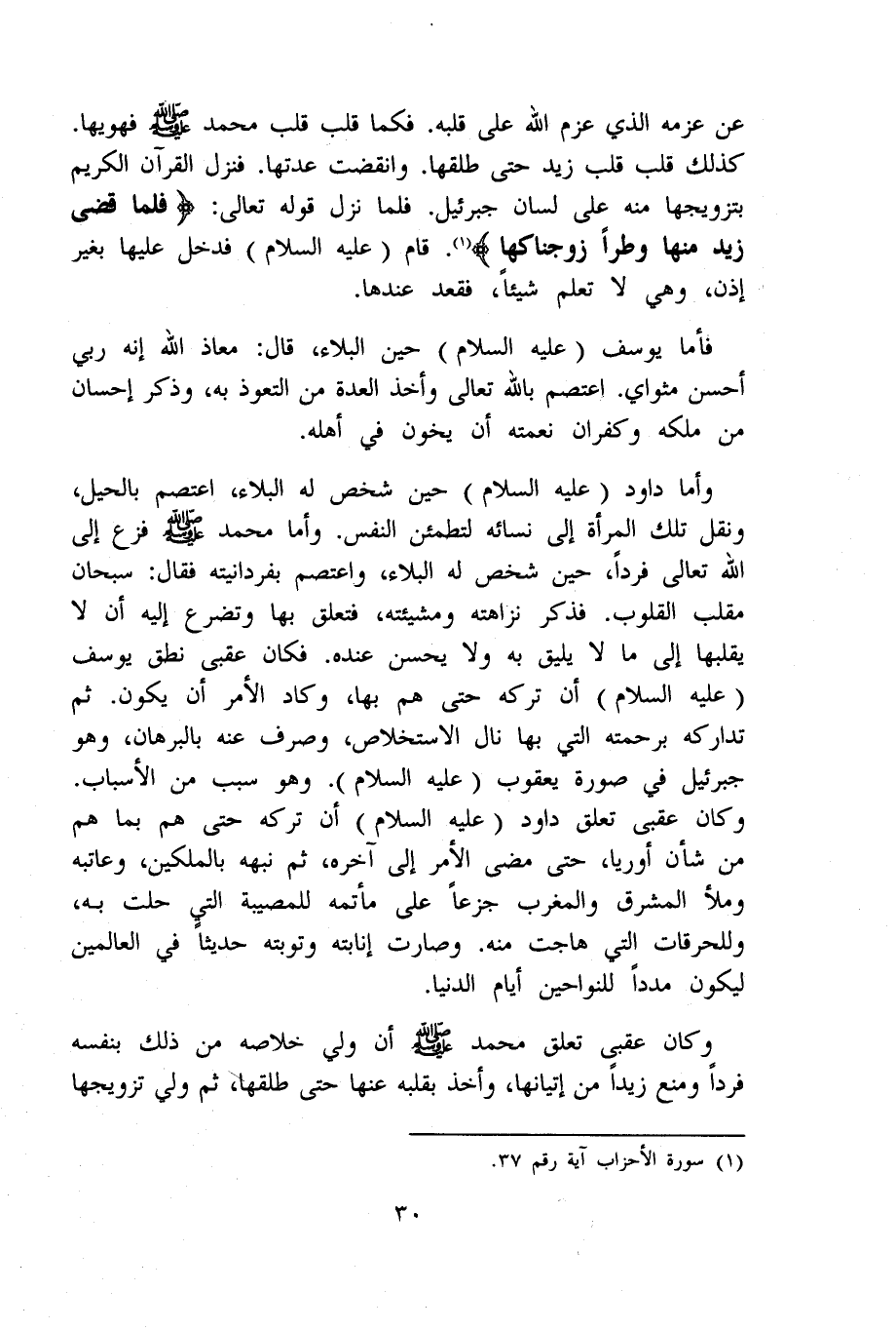 وَأما دَاوُد عَلَيْهِ السَّلَام حِين شخص لَهُ الْبلَاء اعْتصمَ بالحيل وَنقل تِلْكَ الْمَرْأَة إِلَى نِسَائِهِ لتطمئن النَّفس وَأما مُحَمَّد صلى الله عَلَيْهِ وَسلم فزع إِلَى الله تَعَالَى فَردا حِين شخص لَهُ الْبلَاء واعتصم بفردانيته فَقَالَ سُبْحَانَ مُقَلِّب الْقُلُوب فَذكر نزاهته ومشيئته فَتعلق بهَا وتضرع إِلَيْهِ أَن لَا يقلبها إِلَى مَا لَا يَلِيق بِهِ وَلَا يحسن عِنْده فَكَانَ عُقبى نطق يُوسُف عَلَيْهِ السَّلَام أَن تَركه حَتَّى هم بهَا وَكَاد الْأَمر أَن يكون ثمَّ تَدَارُكه برحمته الَّتِي بهَا نَالَ الاستخلاص وَصرف عَنهُ بالبرهان وَهُوَ جبرئيل فِي صُورَة يَعْقُوب عَلَيْهِ السَّلَام وَهُوَ سَبَب من الْأَسْبَاب وَكَانَ عُقبى تعلق دَاوُد عَلَيْهِ السَّلَام أَن تَركه حَتَّى هم بِمَا هم من شَأْن أوريا حَتَّى مضى الْأَمر إِلَى آخِره ثمَّ نبهه بالملكين وعاتبه وملأ الْمشرق وَالْمغْرب جزعا على مأتمه للمصيبة الَّتِي حلت بِهِ وللحرقات الَّتِي هَاجَتْ مِنْهُ وَصَارَت إنابته وتوبته حَدِيثا فِي الْعَالمين ليَكُون مدَدا للنواحين أَيَّام الدُّنْيَا