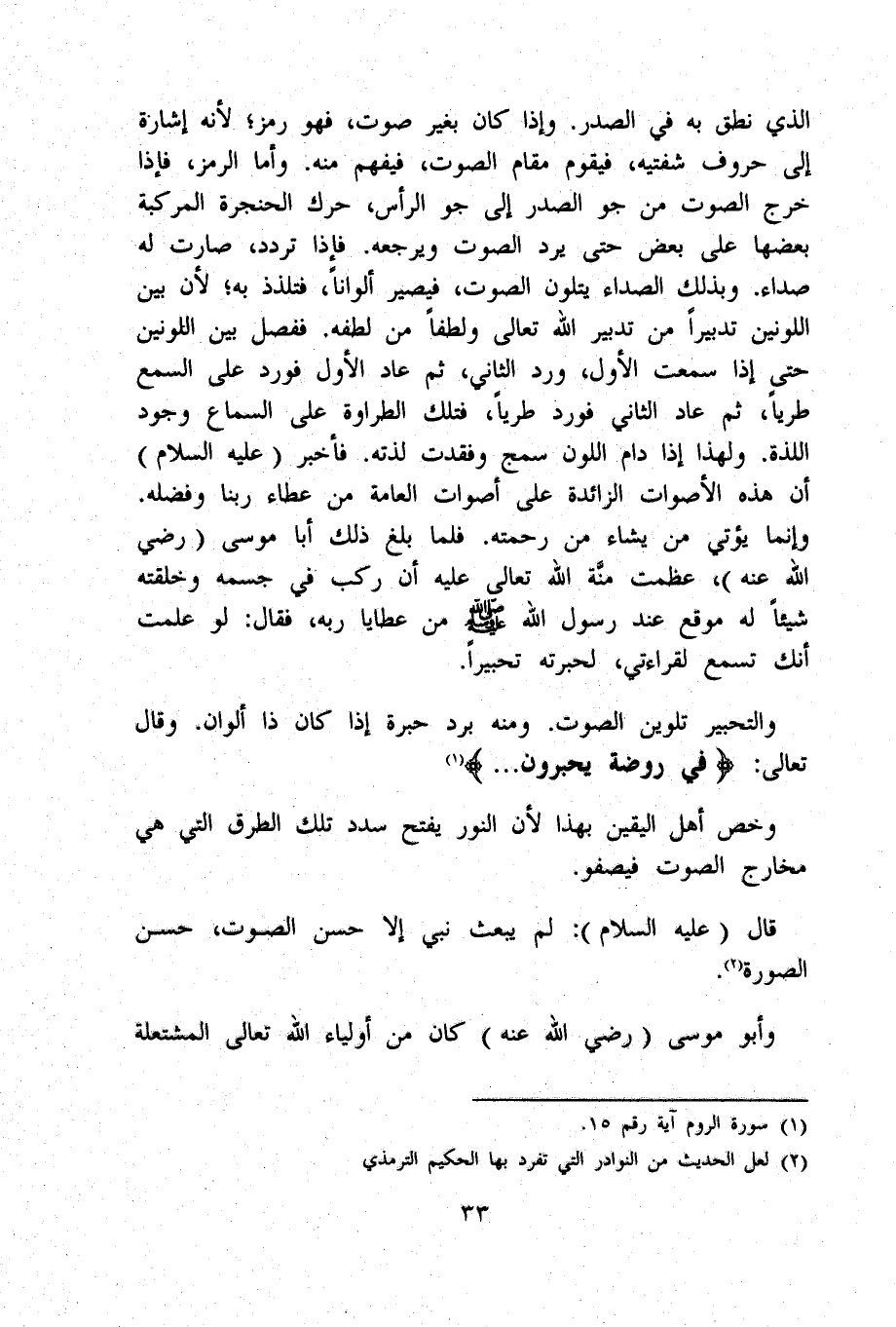 الَّذِي نطق بِهِ فِي الصَّدْر وَإِذا كَانَ بِغَيْر صَوت فَهُوَ رمز لِأَنَّهُ إِشَارَة إِلَى حُرُوف شَفَتَيْه فَيقوم مقَام الصَّوْت فيفهم مِنْهُ وَأما الرَّمْز فَإِذا خرج الصَّوْت من جو الصَّدْر إِلَى جو الرَّأْس حرك الحنجرة المركبة بَعْضهَا على بعض حَتَّى يرد الصَّوْت ويرجعه فَإِذا تردد صَارَت لَهُ صداء وَبِذَلِك الصداء يَتلون الصَّوْت فَيصير ألوانا فتلذذ بِهِ لِأَن بَين اللونين تدبيرا من تَدْبِير الله تَعَالَى ولطفا من لطفه ففصل بَين اللونين حَتَّى إِذا سَمِعت الأول ورد الثَّانِي ثمَّ عَاد الأول فورد على السّمع طريا ثمَّ عَاد الثَّانِي فورد طريا فَتلك الطراوة على السماع وجود اللَّذَّة وَلِهَذَا إِذا دَامَ اللَّوْن سمج وفقدت لذته فَأخْبر عَلَيْهِ السَّلَام أَن هَذِه الْأَصْوَات الزَّائِدَة على أصوات الْعَامَّة من عَطاء رَبنَا وفضله وَإِنَّمَا يُؤْتِي من يَشَاء من رَحمته فَلَمَّا بلغ ذَلِك أَبَا مُوسَى رَضِي الله عَنهُ عظمت منَّة الله تَعَالَى عَلَيْهِ أَن ركب فِي جِسْمه وخلقته شَيْئا لَهُ موقع عِنْد رَسُول الله صلى الله عَلَيْهِ وَسلم من عطايا ربه فَقَالَ لَو علمت أَنَّك تسمع لقراءتي لحبرته تحبيرا