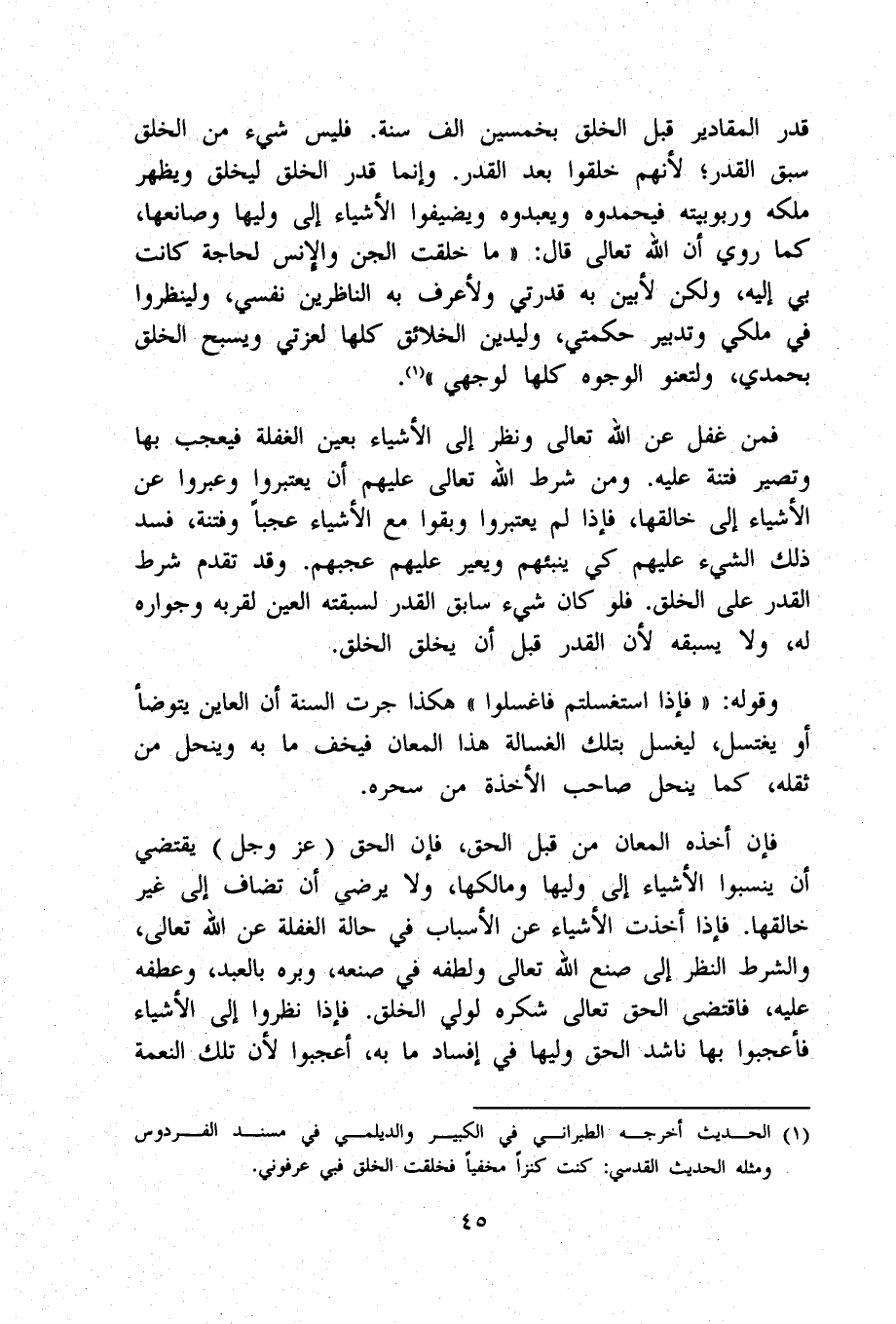 قدر الْمَقَادِير قبل الْخلق بِخَمْسِينَ ألف سنة فَلَيْسَ شَيْء من الْخلق سبق الْقدر لأَنهم خلقُوا بعد الْقدر وَإِنَّمَا قدر الْخلق ليخلق وَيظْهر ملكه وربوبيته فيحمدوه ويعبدوه ويضيفوا الْأَشْيَاء إِلَى وَليهَا وصانعها كَمَا رُوِيَ أَن الله تَعَالَى قَالَ (مَا خلقت الْجِنّ وَالْإِنْس لحَاجَة كَانَت بِي إِلَيْهِ وَلَكِن لأبين بِهِ قدرتي ولأعرف بِهِ الناظرين نَفسِي ولينظروا فِي ملكي وتدبير حكمتي وليدين الْخَلَائق كلهَا لعزتي ويسبح الْخلق بحمدي ولتعنو الْوُجُوه كلهَا لوجهي)