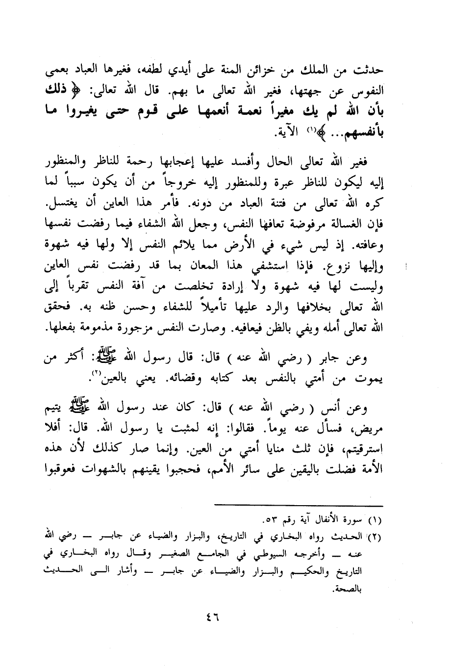 وَعَن جَابر رَضِي الله عَنهُ قَالَ قَالَ رَسُول الله صلى الله عَلَيْهِ وَسلم (أَكثر من يَمُوت من أمتِي بِالنَّفسِ بعد كِتَابه وقضائه) يَعْنِي بِالْعينِ