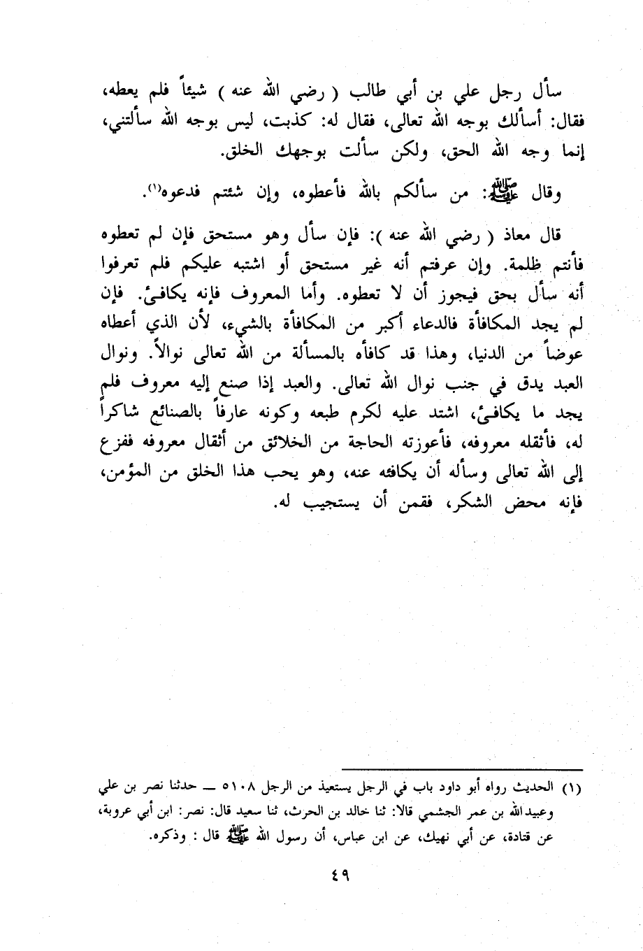 قَالَ معَاذ رَضِي الله عَنهُ فَإِن سَأَلَ وَهُوَ مُسْتَحقّ فَإِن لم تعطوه فَأنْتم ظلمَة وَإِن عَرَفْتُمْ أَنه غير مُسْتَحقّ أَو اشْتبهَ عَلَيْكُم فَلم تعرفوا أَنه سَأَلَ بِحَق فَيجوز أَن لَا تعطوه وَأما الْمَعْرُوف فَإِنَّهُ يُكَافِئ فَإِن لم يجد الْمُكَافَأَة فالدعاء أكبر من الْمُكَافَأَة بالشَّيْء لِأَن الَّذِي أعطَاهُ عوضا من الدُّنْيَا وَهَذَا قد كافأه بِالْمَسْأَلَة من الله تَعَالَى نوالا ونوال العَبْد يدق فِي جنب نوال الله تَعَالَى وَالْعَبْد إِذا صنع إِلَيْهِ مَعْرُوف فَلم يجد مَا يُكَافِئ اشْتَدَّ عَلَيْهِ لكرم طبعه وَكَونه عَارِفًا بالصنائع شاكرا لَهُ فَأَثْقَله مَعْرُوفَة فأوعزته الْحَاجة من الْخَلَائق من أثقال مَعْرُوفَة فَفَزعَ إِلَى الله تَعَالَى وَسَأَلَهُ أَن يُكَافِئهُ عَنهُ وَهُوَ يحب هَذَا الْخلق من الْمُؤمن فَإِنَّهُ مَحْض الشُّكْر فقمن أَن يستجيب لَهُ