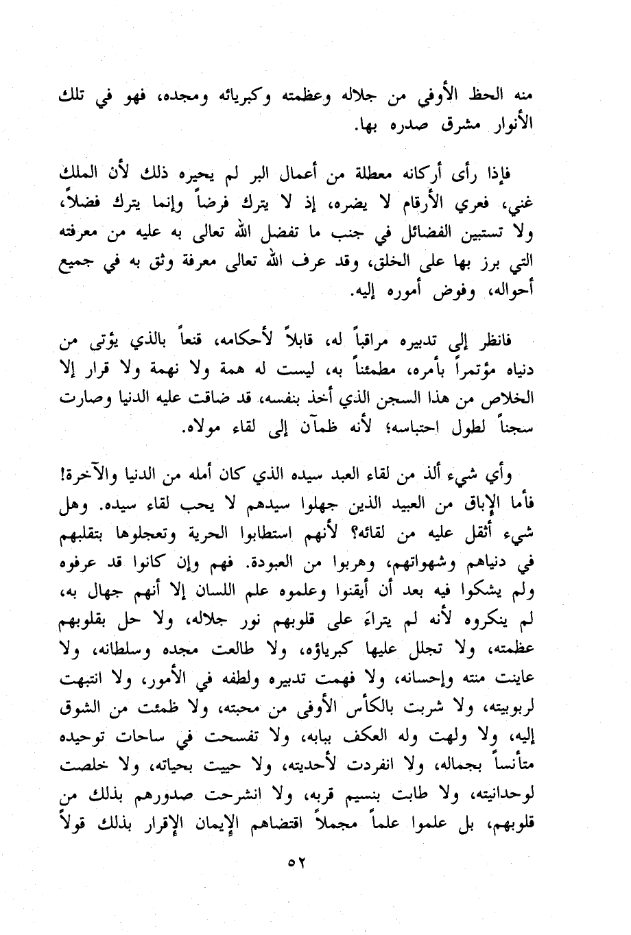 فَإِذا رأى أَرْكَانه معطلة من أَعمال الْبر لم يحيره ذَلِك لِأَن الْملك غَنِي فعري الأرقام لَا يضرّهُ إِذْ لَا يتْرك فرضا وَإِنَّمَا يتْرك فضلا وَلَا تستبين الْفَضَائِل فِي جنب مَا تفضل الله تَعَالَى بِهِ عَلَيْهِ من مَعْرفَته الَّتِي برز بهَا على الْخلق وَقد عرف الله تَعَالَى معرفَة وثق بِهِ فِي جَمِيع أَحْوَاله وفوض أُمُوره إِلَيْهِ