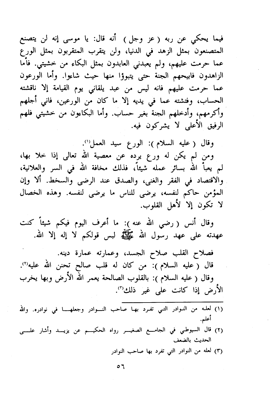 وَمن لم يكن لَهُ ورع يردهُ عَن مَعْصِيّة الله تَعَالَى إِذا خلا بهَا لم يعبأ الله بِسَائِر عمله شَيْئا فَذَلِك مَخَافَة الله فِي السِّرّ وَالْعَلَانِيَة والاقتصاد فِي الْفقر والغنى والصدق عِنْد الرضى والسخط أَلا وَإِن الْمُؤمن حَاكم لنَفسِهِ يرضى للنَّاس مَا يرضى لنَفسِهِ وَهَذِه الْخِصَال لَا تكون إِلَّا لأهل الْقُلُوب