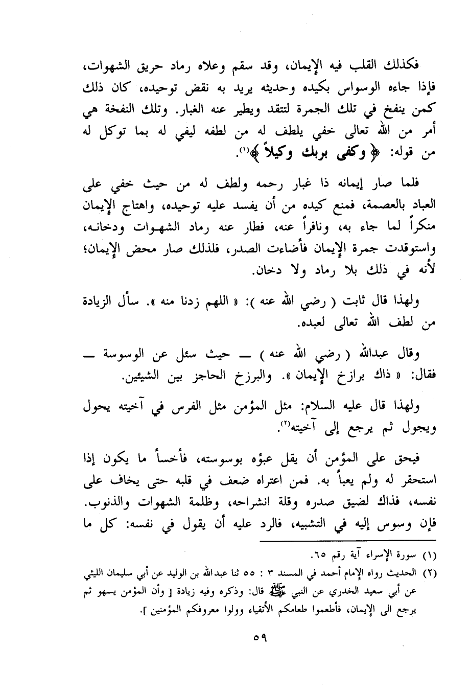 فيحق على الْمُؤمن أَن يقل عبؤه بوسوسته فأخسأ مَا يكون إِذا استحقر لَهُ وَلم يعبأ بِهِ فَمن اعتراه ضعف فِي قلبه حَتَّى يخَاف على نَفسه فَذَاك لضيق صَدره وَقلة انشراحه وظلمة الشَّهَوَات والذنُوب فَإِن وسوس إِلَيْهِ فِي التَّشْبِيه فالرد عَلَيْهِ أَن يَقُول فِي نَفسه كل مَا