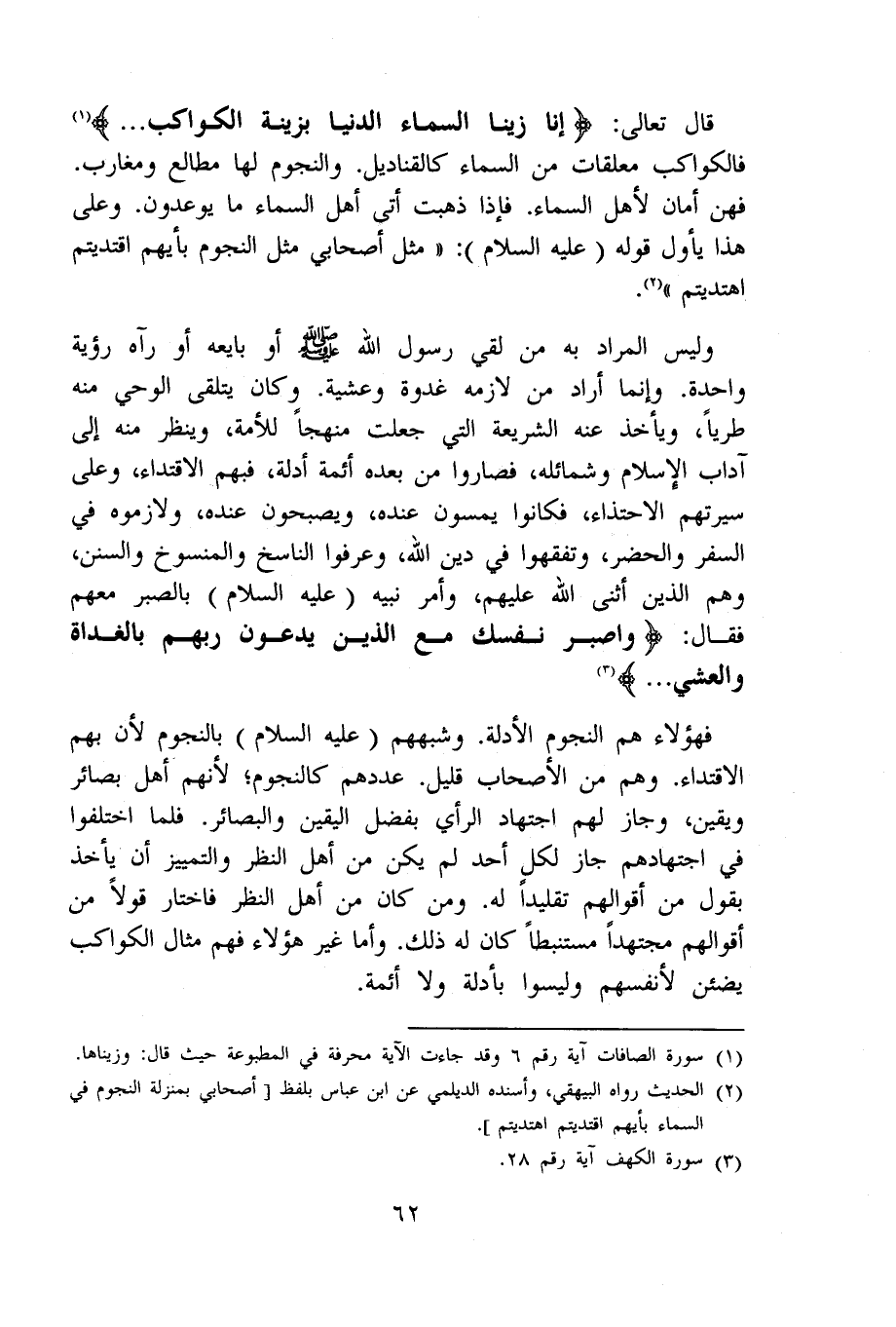 فَهَؤُلَاءِ هم النُّجُوم الْأَدِلَّة وشبههم عَلَيْهِ السَّلَام بالنجوم لِأَن بهم الإقتداء وهم من الْأَصْحَاب قَلِيل عَددهمْ كَالنُّجُومِ لأَنهم أهل بصائر ويقين وَجَاز لَهُم اجْتِهَاد الرَّأْي بِفضل الْيَقِين والبصائر فَلَمَّا اخْتلفُوا فِي اجتهادهم جَازَ لكل أحد لم يكن من أهل النّظر والتمييز أَن يَأْخُذ بقول من أَقْوَالهم تقليدا لَهُ وَمن كَانَ من أهل النّظر فَاخْتَارَ قولا من أَقْوَالهم مُجْتَهدا مستنبطا كَانَ لَهُ ذَلِك وَأما غير هَؤُلَاءِ فهم مِثَال الْكَوَاكِب يضئن لأَنْفُسِهِمْ وَلَيْسوا بأدلة وَلَا أَئِمَّة