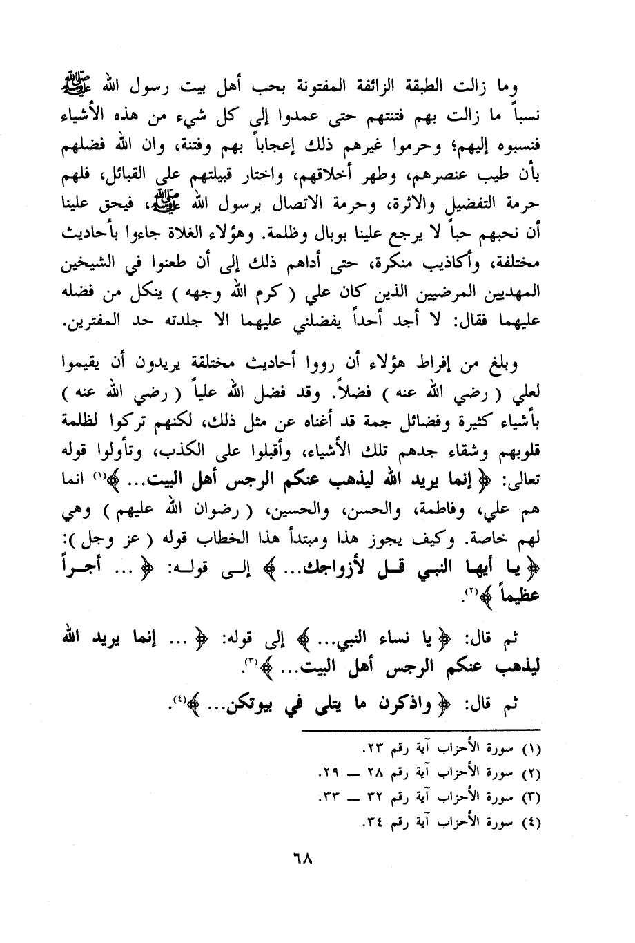 وَمَا زَالَت الطَّبَقَة الزائفة المفتونة بحب أهل بَيت رَسُول الله صلى الله عَلَيْهِ وَسلم نسبا مازالت بهم فتنتهم حَتَّى عَمدُوا إِلَى كل شَيْء من هَذِه الْأَشْيَاء فنسبوه إِلَيْهِم وحرموا غَيرهم ذَلِك إعجابا بهم وفتنة وَإِن الله فَضلهمْ بِأَن طيب عنصرهم وطهر أَخْلَاقهم وَاخْتَارَ قبيلتهم على الْقَبَائِل فَلهم حُرْمَة التَّفْضِيل والأثرة وَحُرْمَة الِاتِّصَال برَسُول الله صلى الله عَلَيْهِ وَسلم فيحق علينا أَن نحبهمْ حبا لَا يرجع علينا بوبال وظلمة وَهَؤُلَاء الغلاة جَاءُوا بِأَحَادِيث مُخْتَلفَة وأكاذيب مُنكرَة حَتَّى أداهم ذَلِك إِلَى أَن طعنوا فِي الشَّيْخَيْنِ المهديين المرضيين الَّذين كَانَ عَليّ كرم الله وَجهه ينكل من فَضله عَلَيْهِمَا فَقَالَ لَا أجد أحدا يُفَضِّلُنِي عَلَيْهِمَا إِلَّا جلدته حد المفترين
