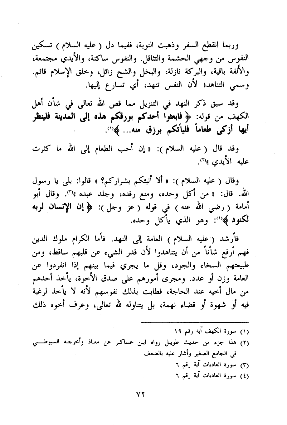 فأرشد عَلَيْهِ السَّلَام الْعَامَّة إِلَى النهد فَأَما الْكِرَام مُلُوك الدّين فهم أرفع شَأْنًا من أَن يتناهدوا لِأَن قدر الشَّيْء عَن قلبهم سَاقِط وَمن طبيعتهم السخاء والجود وَقل مَا يجْرِي فِيمَا بَينهم إِذا انفردوا عَن الْعَامَّة وزن أَو عدد ومجرى أُمُورهم على صدق الْأُخوة يَأْخُذ أحدهم من مَال أَخِيه عِنْد الْحَاجة فطابت بذلك نُفُوسهم لِأَنَّهُ لَا يَأْخُذ لرغبة فِيهِ أَو شَهْوَة أَو قَضَاء نهمة بل يتَنَاوَل لله تَعَالَى وَعرف أَخُوهُ ذَلِك