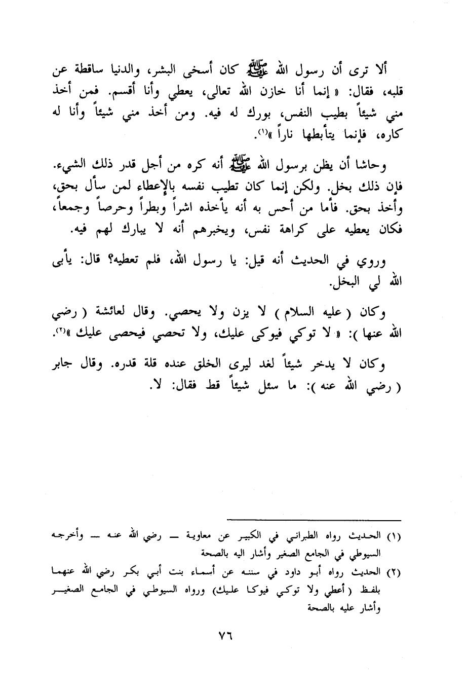 وَكَانَ عَلَيْهِ السَّلَام لَا يزن وَلَا يحصي وَقَالَ لعَائِشَة رَضِي الله عَنْهَا (لَا توكي فيوكى عَلَيْك وَلَا تحصي فيحصى عَلَيْك)