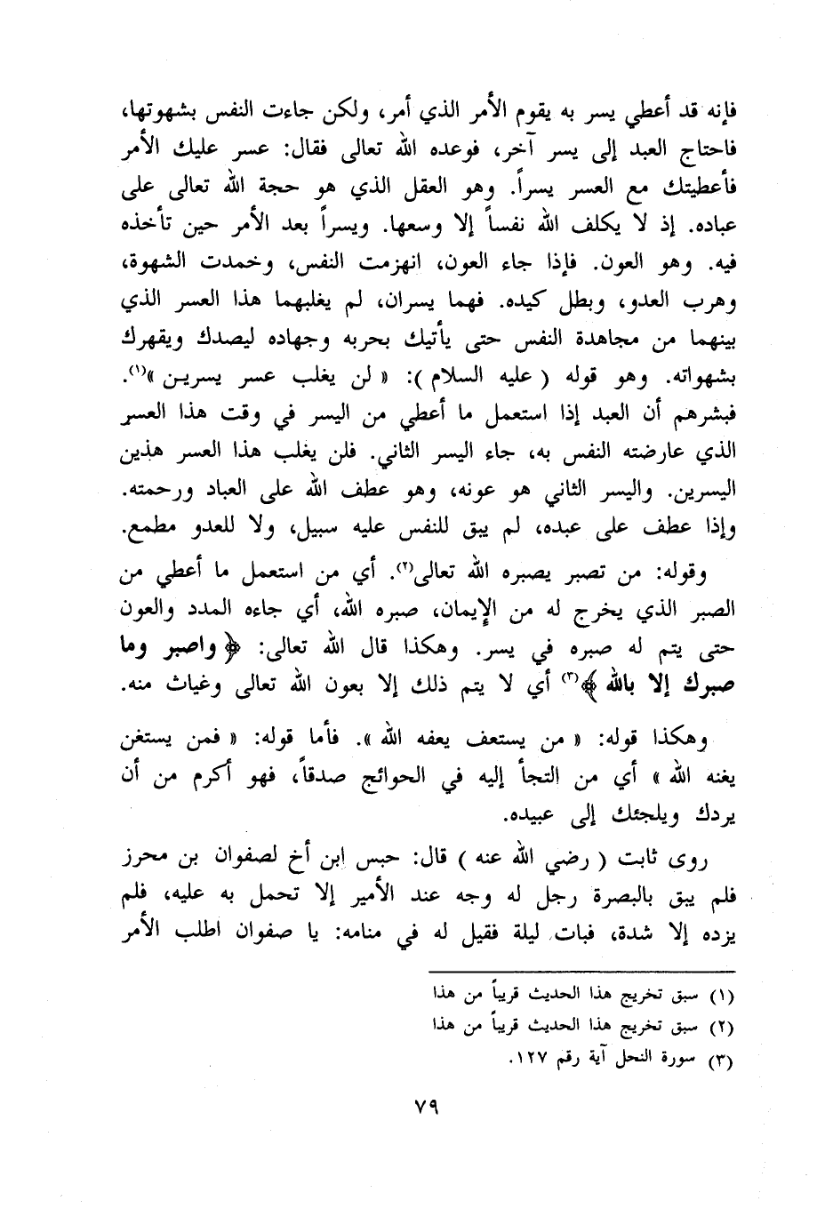 فَإِنَّهُ قد أعطي يسر بِهِ يقوم الْأَمر الَّذِي أَمر وَلَكِن جَاءَت النَّفس بشهوتها فَاحْتَاجَ العَبْد إِلَى يسر آخر فوعده الله تَعَالَى فَقَالَ عسر عَلَيْك الْأَمر فأعطيتك مَعَ الْعسر يسرا وَهُوَ الْعقل الَّذِي هُوَ حجَّة الله تَعَالَى على عباده إِذْ لَا يُكَلف الله نفسا إِلَّا وسعهَا ويسرا بعد الْأَمر حِين تَأْخُذهُ فِيهِ وَهُوَ العون فَإِذا جَاءَ العون انْهَزَمت النَّفس وخمدت الشَّهْوَة وهرب الْعَدو وَبَطل كَيده فهما يسران لم يغلبهما هَذَا الْعسر الَّذِي بَينهمَا من مجاهدة النَّفس حَتَّى يَأْتِيك بحربه وجهاده ليصدك ويقهرك بشهواته وَهُوَ قَوْله عَلَيْهِ السَّلَام (لن يغلب عسر يسرين) فبشرهم أَن العَبْد إِذا اسْتعْمل مَا أعطي من الْيُسْر فِي وَقت هَذَا الْعسر الَّذِي عارضته النَّفس بِهِ جَاءَ الْيُسْر الثَّانِي فَلَنْ يغلب هَذَا الْعسر هذَيْن اليسرين واليسر الثَّانِي هُوَ عونه وَهُوَ عطف الله على الْعباد وَرَحمته وَإِذا عطف على عَبده لم يبْق للنَّفس عَلَيْهِ سَبِيل وَلَا لِلْعَدو مطمع