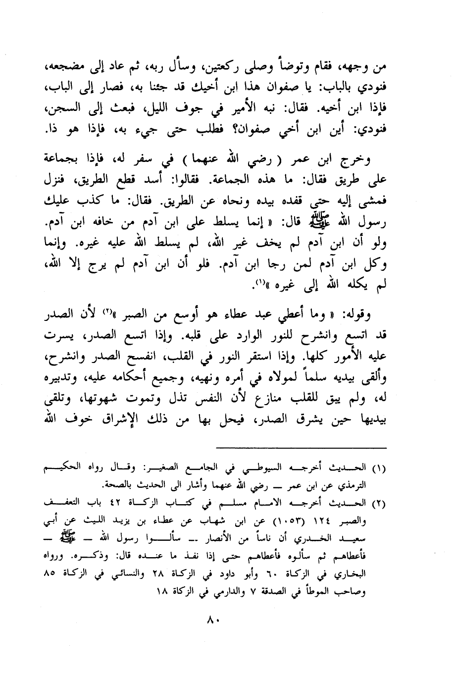 وَخرج ابْن عمر رَضِي الله عَنْهُمَا فِي سفر لَهُ فَإِذا بِجَمَاعَة على طَرِيق فَقَالَ مَا هَذِه الْجَمَاعَة فَقَالُوا أَسد قطع الطَّرِيق فَنزل فَمشى إِلَيْهِ حَتَّى قفده بِيَدِهِ ونحاه عَن الطَّرِيق فَقَالَ مَا كذب عَلَيْك رَسُول الله صلى الله عَلَيْهِ وَسلم قَالَ (إِنَّمَا يُسَلط على ابْن آدم من خافه ابْن آدم وَلَو أَن ابْن آدم لم يخف غير الله لم يُسَلط الله عَلَيْهِ غَيره وَإِنَّمَا وكل ابْن آدم لمن رجا ابْن آدم فَلَو أَن ابْن آدم لم يرج إِلَّا الله لم يكله الله إِلَى غَيره)