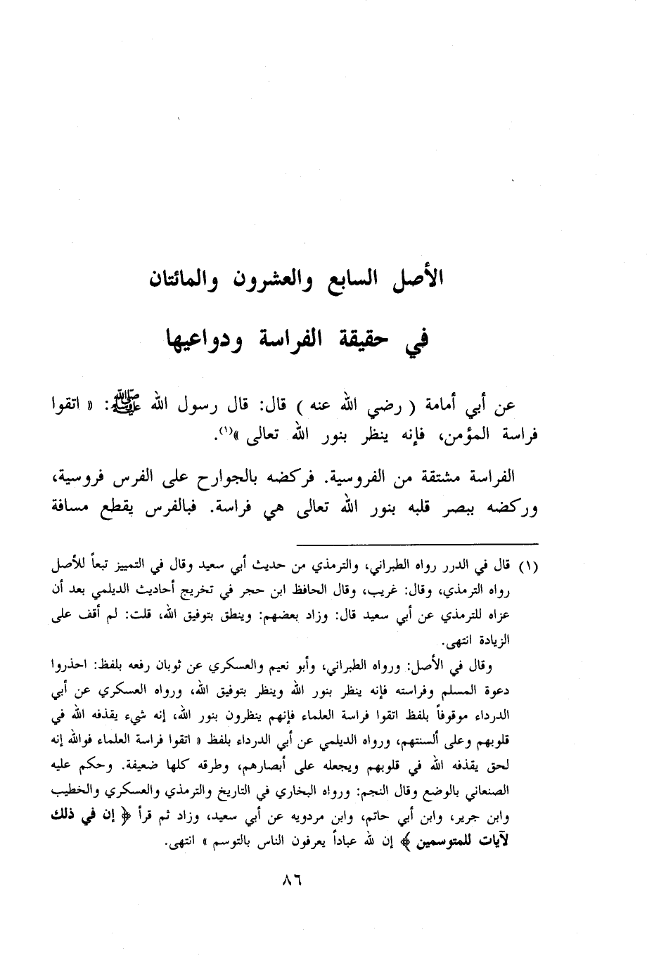 عَن أبي أُمَامَة رَضِي الله عَنهُ قَالَ قَالَ رَسُول الله صلى الله عَلَيْهِ وَسلم (اتَّقوا فراسة الْمُؤمن فَإِنَّهُ ينظر بِنور الله تَعَالَى)
