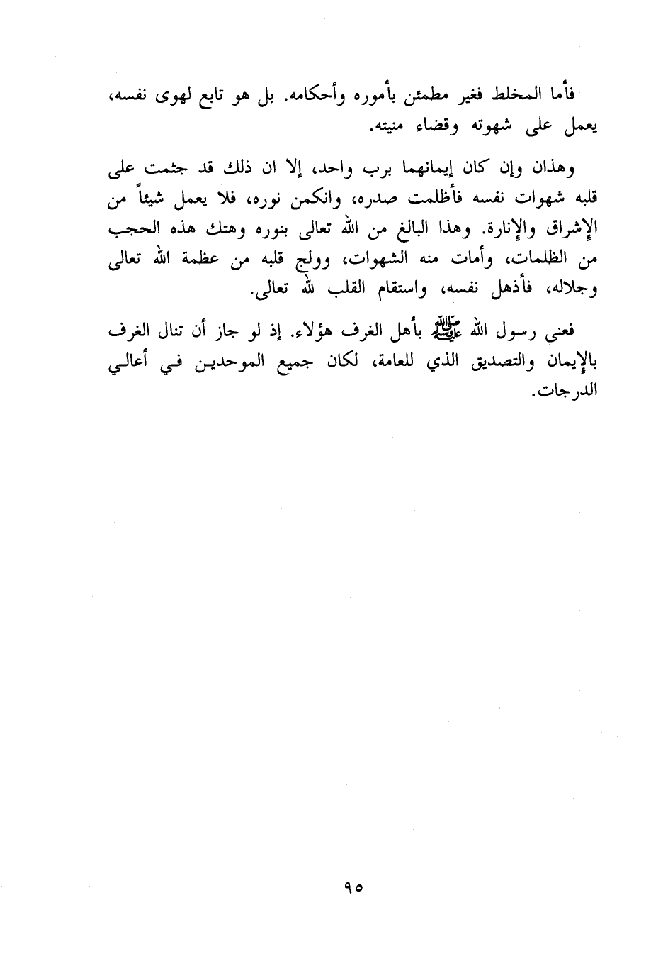 فعنى رَسُول الله صلى الله عَلَيْهِ وَسلم بِأَهْل الغرف هَؤُلَاءِ إِذْ لَو جَازَ أَن تنَال الغرف بِالْإِيمَان والتصديق الَّذِي للعامة لَكَانَ جَمِيع الْمُوَحِّدين فِي أعالي الدَّرَجَات