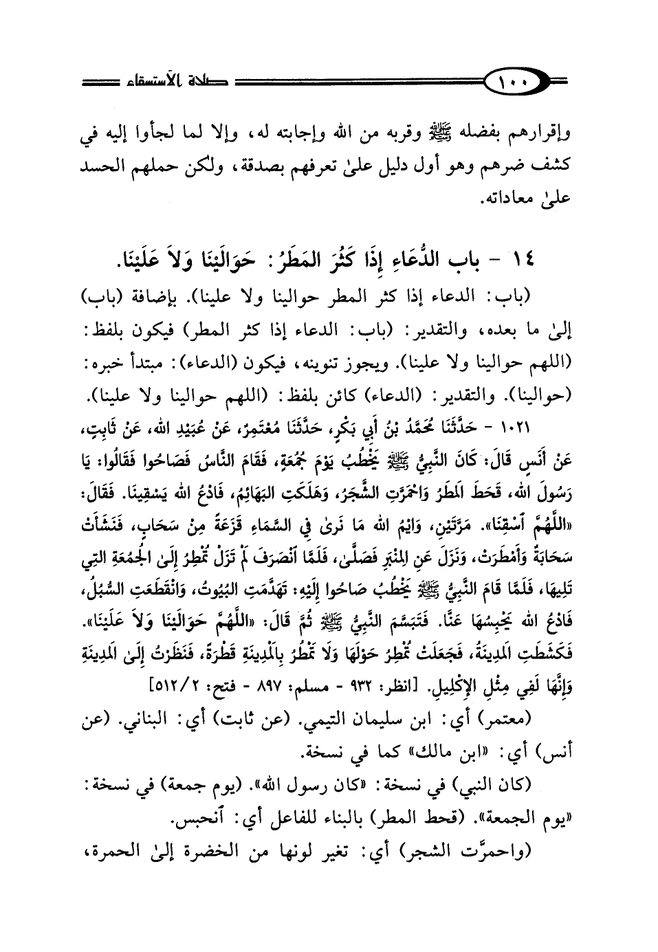 (باب: الدعاء إذا كثر المطر حوالينا ولا علينا). بإضافة (باب) إلى ما بعده، والتقدير: (باب: الدعاء إذا كثر المطر) فيكون بلفظ: (اللهم حوالينا ولا علينا). ويجوز تنوينه، فيكون (الدعاء): مبتدأ خبره: (حوالينا). والتقدير: (الدعاء) كائن بلفظ: (اللهم حوالينا ولا علينا).