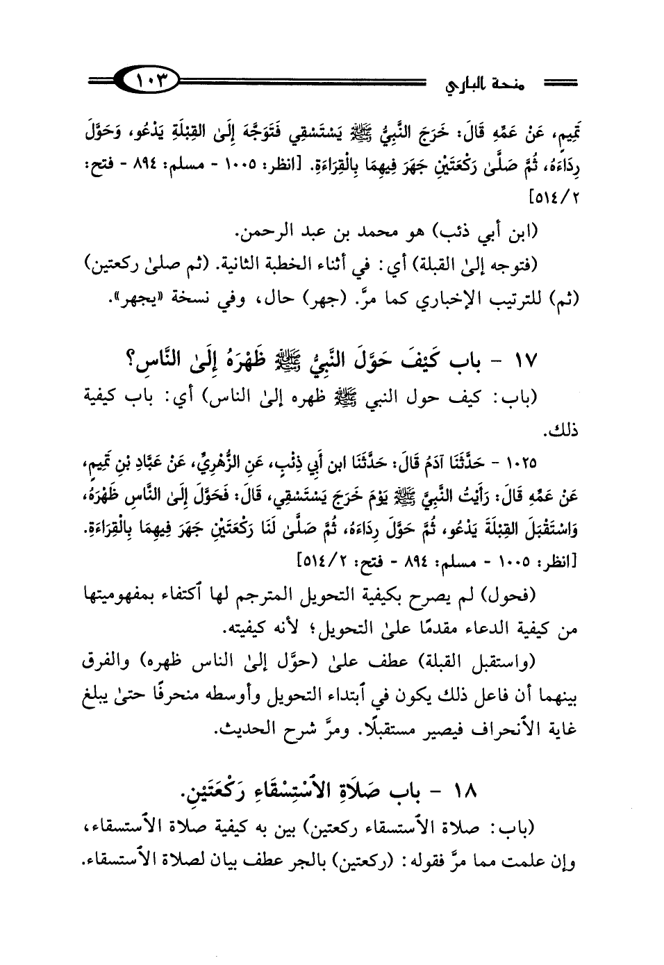 تَمِيمٍ، عَنْ عَمِّهِ، قَال: "خَرَجَ النَّبِيُّ صَلَّى اللهُ عَلَيْهِ وَسَلَّمَ يَسْتَسْقِي، فَتَوَجَّهَ إِلَى القِبْلَةِ يَدْعُو وَحَوَّلَ رِدَاءَهُ، ثُمَّ صَلَّى رَكْعَتَيْنِ جَهَرَ فِيهِمَا بِالقِرَاءَةِ".