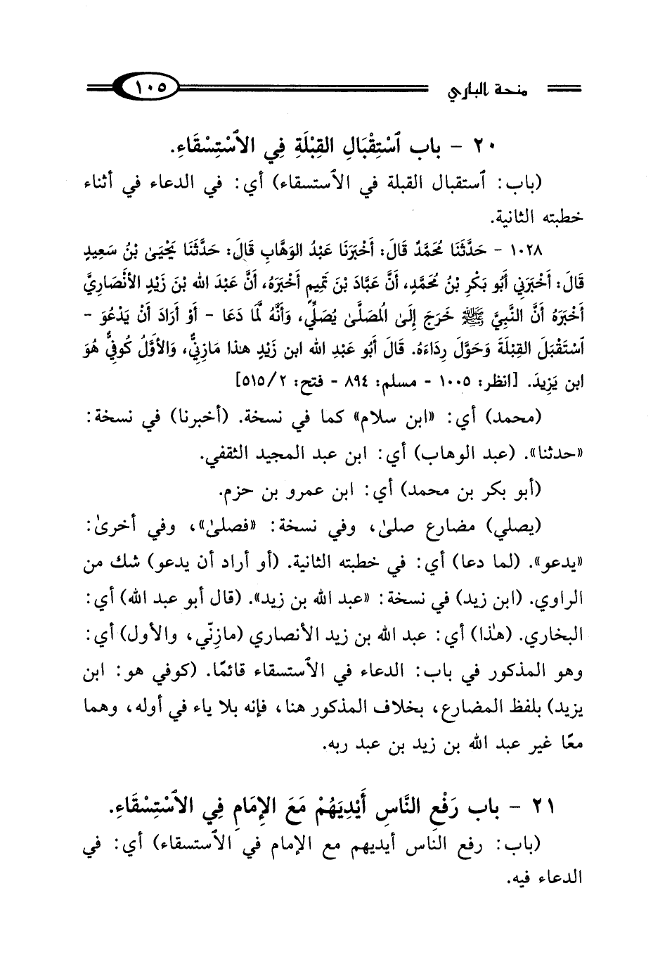 1028 - حَدَّثَنَا مُحَمَّدُ بْنُ سَلامٍ، قَال: أَخْبَرَنَا عَبْدُ الوَهَّابِ، قَال: حَدَّثَنَا يَحْيَى بْنُ سَعِيدٍ، قَال: أَخْبَرَنِي أَبُو بَكْرِ بْنُ مُحَمَّدٍ، أَنَّ عَبَّادَ بْنَ تَمِيمٍ، أَخْبَرَهُ: أَنَّ عَبْدَ اللَّهِ بْنَ زَيْدٍ الأَنْصَارِيَّ أَخْبَرَهُ: "أَنَّ النَّبِيَّ صَلَّى اللهُ عَلَيْهِ وَسَلَّمَ خَرَجَ إِلَى المُصَلَّى يُصَلِّي، وَأَنَّهُ لَمَّا دَعَا - أَوْ أَرَادَ أَنْ يَدْعُوَ - اسْتَقْبَلَ القِبْلَةَ وَحَوَّلَ رِدَاءَهُ" قَال أَبُو عَبْدِ اللَّهِ: "عَبْدُ اللَّهِ بْنُ زَيْدٍ هَذَا مَازِنِيٌّ، وَالأَوَّلُ كُوفِيٌّ هُوَ ابْنُ يَزِيدَ".