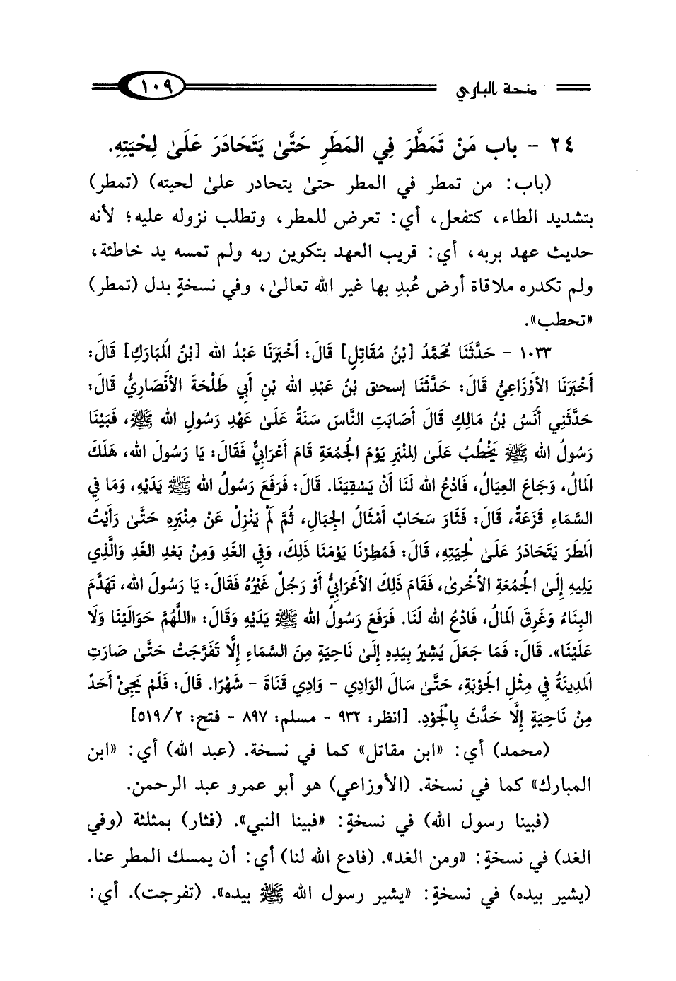 1033 - حَدَّثَنَا مُحَمَّدُ بْنُ مُقَاتِلٍ، قَال: أَخْبَرَنَا عَبْدُ اللَّهِ بْنُ المُبَارَكِ، قَال: أَخْبَرَنَا الأَوْزَاعِيُّ، قَال: حَدَّثَنَا إِسْحَاقُ بْنُ عَبْدِ اللَّهِ بْنِ أَبِي طَلْحَةَ الأَنْصَارِيُّ، قَال: حَدَّثَنِي أَنَسُ بْنُ مَالِكٍ، قَال: أَصَابَتِ النَّاسَ سَنَةٌ عَلَى عَهْدِ رَسُولِ اللَّهِ صَلَّى اللهُ عَلَيْهِ وَسَلَّمَ، فَبَيْنَا رَسُولُ اللَّهِ صَلَّى اللهُ عَلَيْهِ وَسَلَّمَ يَخْطُبُ عَلَى المِنْبَرِ يَوْمَ الجُمُعَةِ قَامَ أَعْرَابِيٌّ، فَقَال: يَا رَسُولَ اللَّهِ، هَلَكَ المَالُ، وَجَاعَ العِيَالُ، فَادْعُ اللَّهَ لَنَا أَنْ يَسْقِيَنَا، قَال: فَرَفَعَ رَسُولُ اللَّهِ صَلَّى اللهُ عَلَيْهِ وَسَلَّمَ يَدَيْهِ وَمَا فِي السَّمَاءِ قَزَعَةٌ، قَال: فَثَارَ سَحَابٌ أَمْثَالُ الجِبَالِ، ثُمَّ لَمْ يَنْزِلْ عَنْ مِنْبَرِهِ حَتَّى رَأَيْتُ المَطَرَ يَتَحَادَرُ عَلَى لِحْيَتِهِ، قَال: فَمُطِرْنَا يَوْمَنَا ذَلِكَ، وَفِي الغَدِ، وَمِنْ بَعْدِ الغَدِ، وَالَّذِي يَلِيهِ إِلَى الجُمُعَةِ الأُخْرَى، فَقَامَ ذَلِكَ الأَعْرَابِيُّ - أَوْ رَجُلٌ غَيْرُهُ - فَقَال: يَا رَسُولَ اللَّهِ، تَهَدَّمَ البِنَاءُ وَغَرِقَ المَالُ، فَادْعُ اللَّهَ لَنَا، فَرَفَعَ رَسُولُ اللَّهِ صَلَّى اللهُ عَلَيْهِ وَسَلَّمَ يَدَيْهِ، وَقَال: "اللَّهُمَّ حَوَاليْنَا، وَلَا عَلَيْنَا" قَال: فَمَا جَعَلَ رَسُولُ اللَّهِ صَلَّى اللهُ عَلَيْهِ وَسَلَّمَ يُشِيرُ بِيَدِهِ إِلَى نَاحِيَةٍ مِنَ السَّمَاءِ إلا تَفَرَّجَتْ، حَتَّى صَارَتِ المَدِينَةُ فِي مِثْلِ الجَوْبَةِ حَتَّى سَال الوَادِي، وَادِي قَنَاةَ شَهْرًا، قَال: فَلَمْ يَجِئْ أَحَدٌ مِنْ نَاحِيَةٍ إلا حَدَّثَ بِالْجَوْدِ.