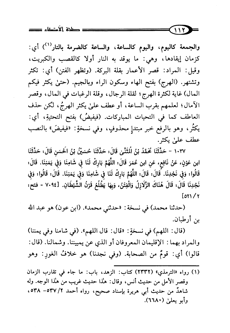 1037 - حَدَّثَنَا مُحَمَّدُ بْنُ المُثَنَّى، قَال: حَدَّثَنَا حُسَيْنُ بْنُ الحَسَنِ، قَال: حَدَّثَنَا ابْنُ عَوْنٍ، عَنْ نَافِعٍ، عَنِ ابْنِ عُمَرَ، قَال: قَال: "اللَّهُمَّ بَارِكْ لَنَا فِي شَامِنَا، وَفِي يَمَنِنَا" قَال: قَالُوا: وَفِي نَجْدِنَا؟ قَال: قَال: "اللَّهُمَّ بَارِكْ لَنَا فِي شَامِنَا وَفِي يَمَنِنَا" قَال: قَالُوا: وَفِي نَجْدِنَا؟ قَال: قَال: "هُنَاكَ الزَّلازِلُ وَالفِتَنُ، وَبِهَا يَطْلُعُ قَرْنُ الشَّيْطَانِ".
