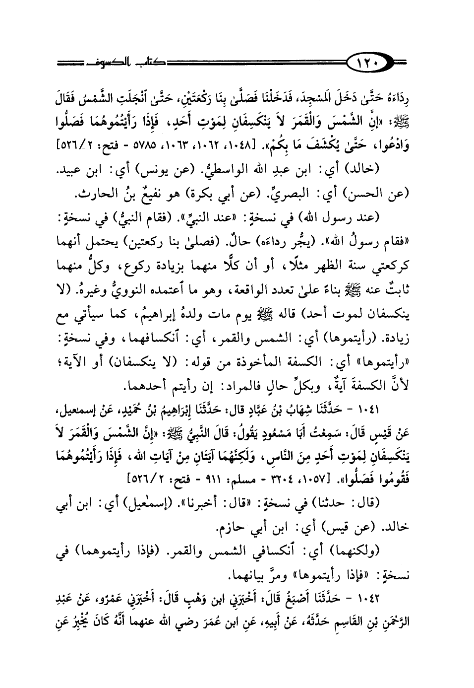 (عند رسول الله) في نسخةٍ: "عند النبيِّ". (فقام النبيُّ) في نسخةٍ: "فقام رسولُ الله". (يجرُّ رداءَه) حالٌ. (فصلى بنا ركعتين) يحتمل أنهما كركعتي سنة الظهر مثلًا، أو أن كلًّا منهما بزيادة ركوع، وكل منهما ثابت عنه لصلى الله عليه وسلم بناءً على تعدد الواقعة، وهو ما اعتمده النوويُّ وغيرهُ. (لا ينكسفان لموت أحد) قاله - صلى الله عليه وسلم - يوم مات ولدة إبراهيم، كما سيأتي مع زيادة. (رأيتموها) أي: الشمس والقمر، أي: انكسافهما، وفي نسخةٍ: "رأيتموها" أي: الكسفة المأخوذة من قوله: (لا ينكسفان) أو الآية؛ لأنَّ الكسفةَ آيةٌ، وبكل حالٍ فالمراد: إن رأيتم أحدهما.