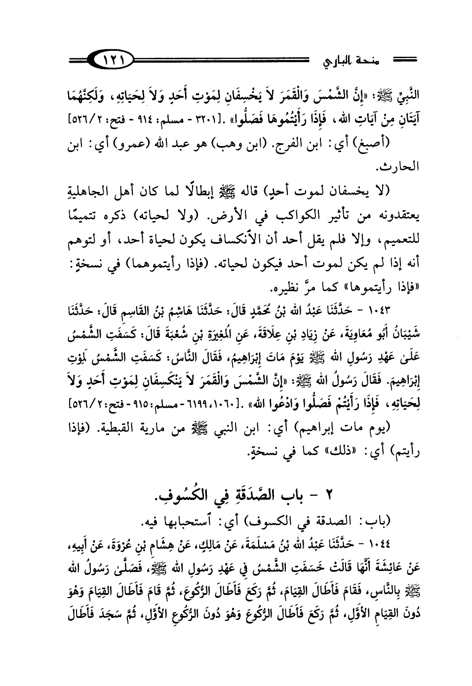 النَّبِيِّ صَلَّى اللهُ عَلَيْهِ وَسَلَّمَ: "إِنَّ الشَّمْسَ وَالقَمَرَ لَا يَخْسِفَانِ لِمَوْتِ أَحَدٍ وَلَا لِحَيَاتِهِ، وَلَكِنَّهُمَا آيَتَانِ مِنْ آيَاتِ اللَّهِ، فَإِذَا رَأَيْتُمُوهَا فَصَلُّوا".