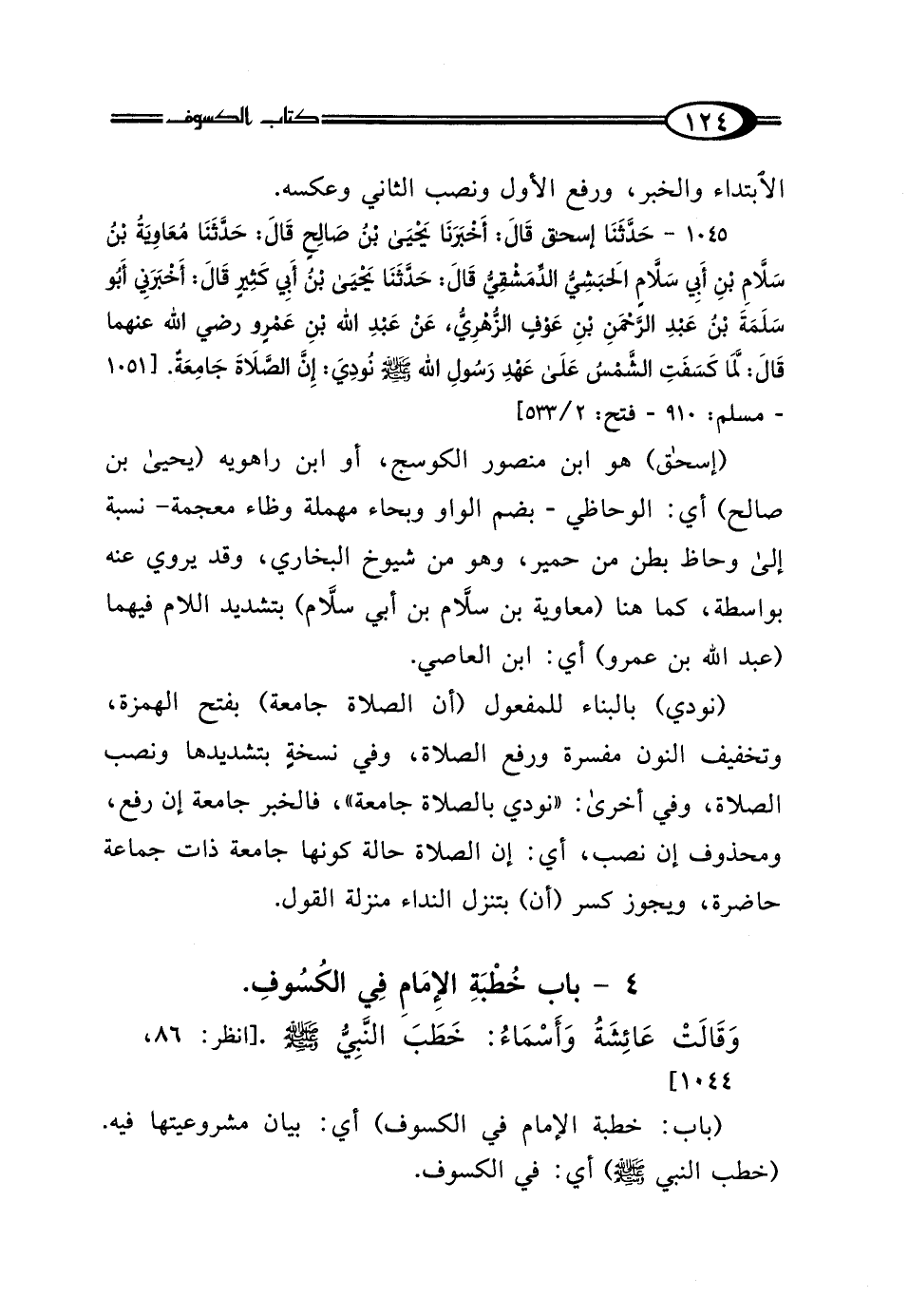 1045 - حَدَّثَنَا إِسْحَاقُ، قَال: أَخْبَرَنَا يَحْيَى بْنُ صَالِحٍ، قَال: حَدَّثَنَا مُعَاويَةُ بْنُ سَلَّامِ بْنِ أَبِي سَلَّامٍ الحَبَشِيُّ الدِّمَشْقِيُّ، قَال: حَدَّثَنَا يَحْيَى بْنُ أَبِي كَثِيرٍ، قَال: أَخْبَرَنِي أَبُو سَلَمَةَ بْنُ عَبْدِ الرَّحْمَنِ بْنِ عَوْفٍ الزُّهْرِيُّ، عَنْ عَبْدِ اللَّهِ بْنِ عَمْرٍو رَضِيَ اللَّهُ عَنْهُمَا، قَال: "لَمَّا كَسَفَتِ الشَّمْسُ عَلَى عَهْدِ رَسُولِ اللَّهِ صَلَّى اللهُ عَلَيْهِ وَسَلَّمَ نُودِيَ إِنَّ الصَّلاةَ جَامِعَةٌ".