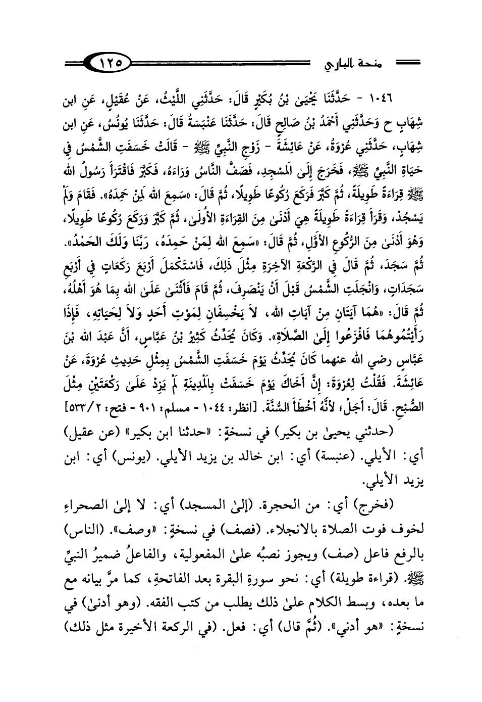 1046 - حَدَّثَنَا يَحْيَى بْنُ بُكَيْرٍ، قَال: حَدَّثَنِي اللَّيْثُ، عَنْ عُقَيْلٍ، عَنِ ابْنِ شِهَابٍ، ح وَحَدَّثَنِي أَحْمَدُ بْنُ صَالِحٍ، قَال: حَدَّثَنَا عَنْبَسَةُ، قَال: حَدَّثَنَا يُونُسُ، عَنِ ابْنِ شِهَابٍ، حَدَّثَنِي عُرْوَةُ، عَنْ عَائِشَةَ، زَوْجِ النَّبِيِّ صَلَّى اللهُ عَلَيْهِ وَسَلَّمَ، قَالتْ: خَسَفَتِ الشَّمْسُ فِي حَيَاةِ النَّبِيِّ صَلَّى اللهُ عَلَيْهِ وَسَلَّمَ، فَخَرَجَ إِلَى المَسْجِدِ، فَصَفَّ النَّاسُ وَرَاءَهُ، فَكَبَّرَ فَاقْتَرَأَ رَسُولُ اللَّهِ صَلَّى اللهُ عَلَيْهِ وَسَلَّمَ قِرَاءَةً طَويلَةً، ثُمَّ كَبَّرَ فَرَكَعَ رُكُوعًا طَويلًا، ثُمَّ قَال: سَمِعَ اللَّهُ لِمَنْ حَمِدَهُ، فَقَامَ وَلَمْ يَسْجُدْ، وَقَرَأَ قِرَاءَةً طَويلَةً هِيَ أَدْنَى مِنَ القِرَاءَةِ الأُولَى، ثُمَّ كَبَّرَ وَرَكَعَ رُكُوعًا طَويلًا وَهُوَ أَدْنَى مِنَ الرُّكُوعِ الأَوَّلِ، ثُمَّ قَال: سَمِعَ اللَّهُ لِمَنْ حَمِدَهُ، رَبَّنَا وَلَكَ الحَمْدُ، ثُمَّ سَجَدَ، ثُمَّ قَال فِي الرَّكْعَةِ الآخِرَةِ مِثْلَ ذَلِكَ، فَاسْتَكْمَلَ أَرْبَعَ رَكَعَاتٍ فِي أَرْبَعِ سَجَدَاتٍ، وَانْجَلَتِ الشَّمْسُ قَبْلَ أَنْ يَنْصَرِفَ، ثُمَّ قَامَ، فَأَثْنَى عَلَى اللَّهِ بِمَا هُوَ أَهْلُهُ ثُمَّ قَال: "هُمَا آيَتَانِ مِنْ آيَاتِ اللَّهِ، لَا يَخْسِفَانِ لِمَوْتِ أَحَدٍ وَلَا لِحَيَاتِهِ، فَإِذَا رَأَيْتُمُوهُمَا فَافْزَعُوا إِلَى الصَّلاةِ" وَكَانَ يُحَدِّثُ كَثِيرُ بْنُ عَبَّاسٍ، أَنَّ عَبْدَ اللَّهِ بْنَ عَبَّاسٍ رَضِيَ اللَّهُ عَنْهُمَا، كَانَ يُحَدِّثُ يَوْمَ خَسَفَتِ الشَّمْسُ، بِمِثْلِ حَدِيثِ عُرْوَةَ، عَنْ عَائِشَةَ، فَقُلْتُ لِعُرْوَةَ: "إِنَّ أَخَاكَ يَوْمَ خَسَفَتْ بِالْمَدِينَةِ لَمْ يَزِدْ عَلَى رَكْعَتَيْنِ مِثْلَ الصُّبْحِ؟ قَال: أَجَلْ، لِأَنَّهُ أَخْطَأَ السُّنَّةَ".