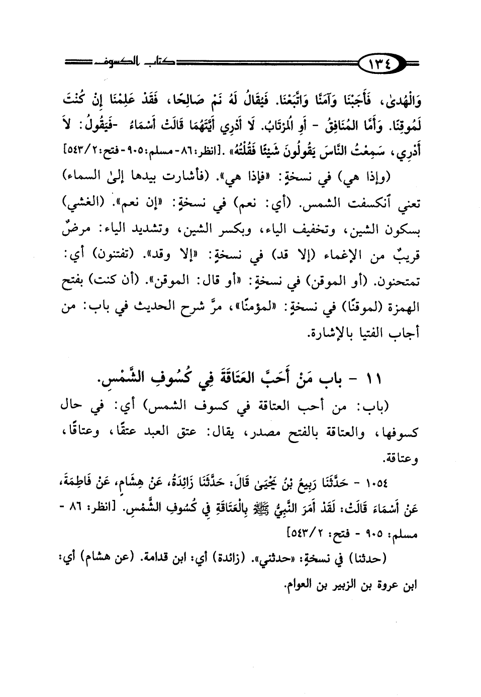 1054 - حَدَّثَنَا رَبِيعُ بْنُ يَحْيَى، قَال: حَدَّثَنَا زَائِدَةُ، عَنْ هِشَامٍ، عَنْ فَاطِمَةَ، عَنْ أَسْمَاءَ، قَالتْ: لَقَدْ "أَمَرَ النَّبِيُّ صَلَّى اللهُ عَلَيْهِ وَسَلَّمَ بِالعَتَاقَةِ فِي كُسُوفِ الشَّمْسِ".