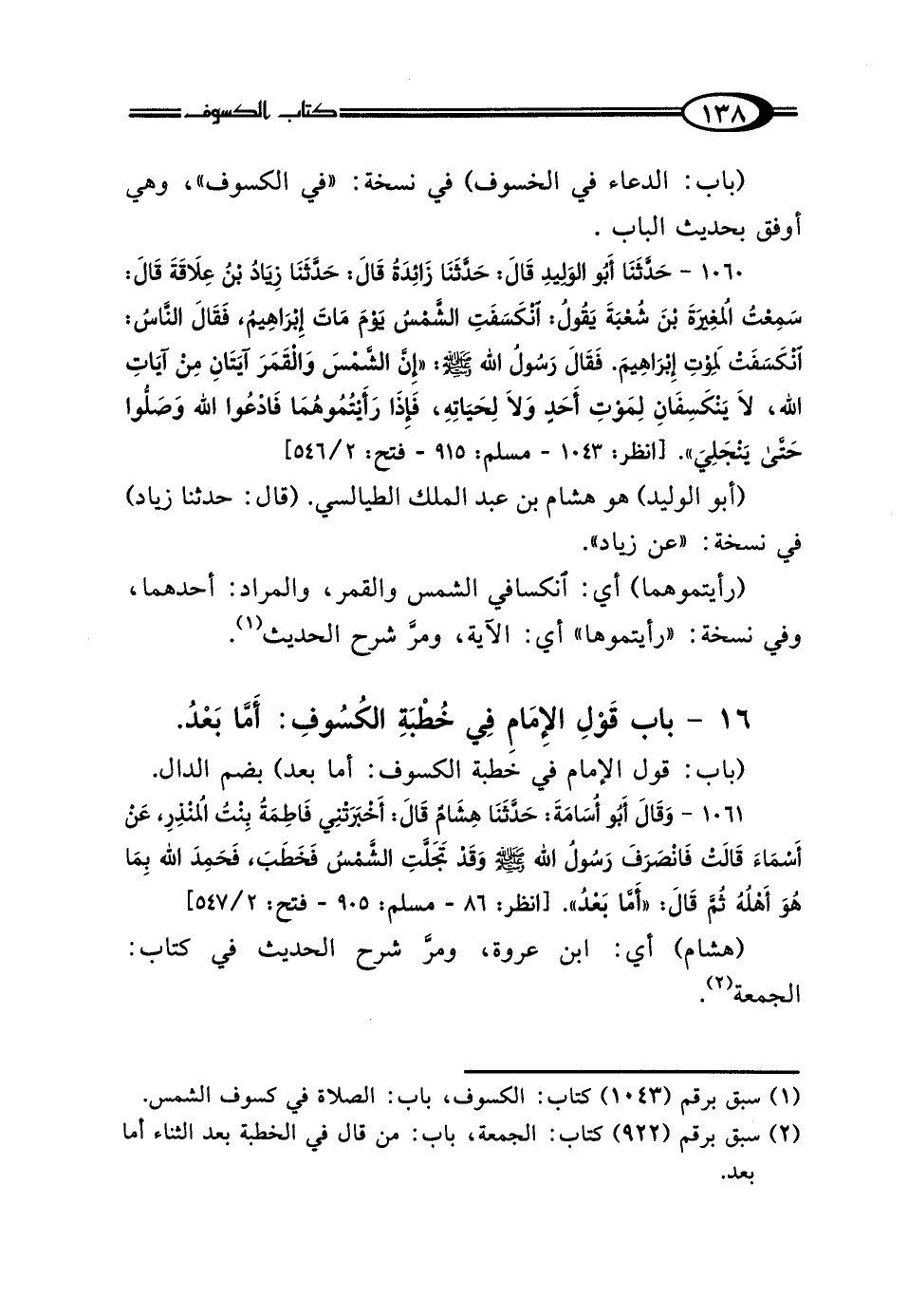 1061 - وَقَال أَبُو أُسَامَةَ، حَدَّثَنَا هِشَامٌ، قَال: أَخْبَرَتْنِي فَاطِمَةُ بِنْتُ المُنْذِرِ، عَنْ أَسْمَاءَ، قَالتْ: "فَانْصَرَفَ رَسُولُ اللَّهِ صَلَّى اللهُ عَلَيْهِ وَسَلَّمَ وَقَدْ تَجَلَّتِ الشَّمْسُ، فَخَطَبَ فَحَمِدَ اللَّهَ بِمَا هُوَ أَهْلُهُ ثُمَّ قَال: "أَمَّا بَعْدُ".