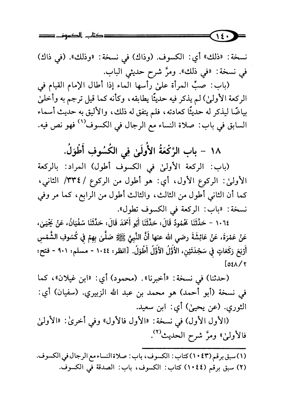 1064 - حَدَّثَنَا مَحْمُودُ بْنُ غَيْلانَ، قَال: حَدَّثَنَا أَبُو أَحْمَدَ، قَال: حَدَّثَنَا سُفْيَانُ، عَنْ يَحْيَى، عَنْ عَمْرَةَ، عَنْ عَائِشَةَ رَضِيَ اللَّهُ عَنْهَا: "أَنَّ النَّبِيَّ صَلَّى اللهُ عَلَيْهِ وَسَلَّمَ صَلَّى بِهِمْ فِي كُسُوفِ الشَّمْسِ أَرْبَعَ رَكَعَاتٍ فِي سَجْدَتَيْنِ الأَوَّلُ الأَوَّلُ أَطْوَلُ".