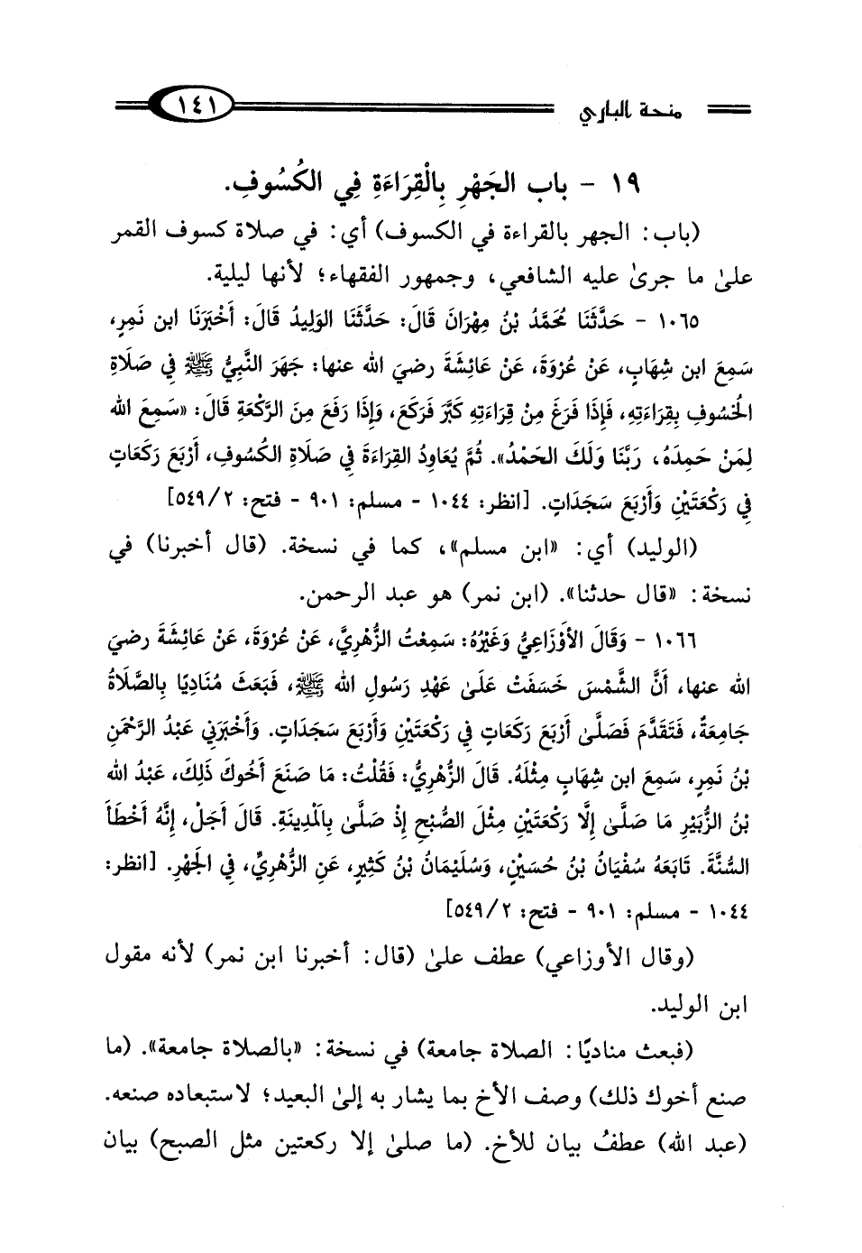 1066 - وَقَال الأَوْزَاعِيُّ، وَغَيْرُهُ، سَمِعْتُ الزُّهْرِيَّ، عَنْ عُرْوَةَ، عَنْ عَائِشَةَ رَضِيَ اللَّهُ عَنْهَا، أَنَّ الشَّمْسَ خَسَفَتْ عَلَى عَهْدِ رَسُولِ اللَّهِ صَلَّى اللهُ عَلَيْهِ وَسَلَّمَ، فَبَعَثَ مُنَادِيًا: بالصَّلاةُ جَامِعَةٌ، فَتَقَدَّمَ فَصَلَّى أَرْبَعَ رَكَعَاتٍ فِي رَكْعَتَيْنِ، وَأَرْبَعَ سَجَدَاتٍ، وَأَخْبَرَنِي عَبْدُ الرَّحْمَنِ بْنُ نَمِرٍ، سَمِعَ ابْنَ شِهَابٍ مِثْلَهُ قَال الزُّهْرِيُّ: فَقُلْتُ: "مَا صَنَعَ أَخُوكَ ذَلِكَ عَبْدُ اللَّهِ بْنُ الزُّبَيْرِ مَا صَلَّى إلا رَكْعَتَيْنِ مِثْلَ الصُّبْحِ، إِذْ صَلَّى بِالْمَدِينَةِ، قَال: أَجَلْ إِنَّهُ أَخْطَأَ السُّنَّةَ " تَابَعَهُ سُفْيَانُ بْنُ حُسَيْنٍ، وَسُلَيْمَانُ بْنُ كَثِيرٍ، عَنِ الزُّهْرِيِّ فِي الجَهْرِ.