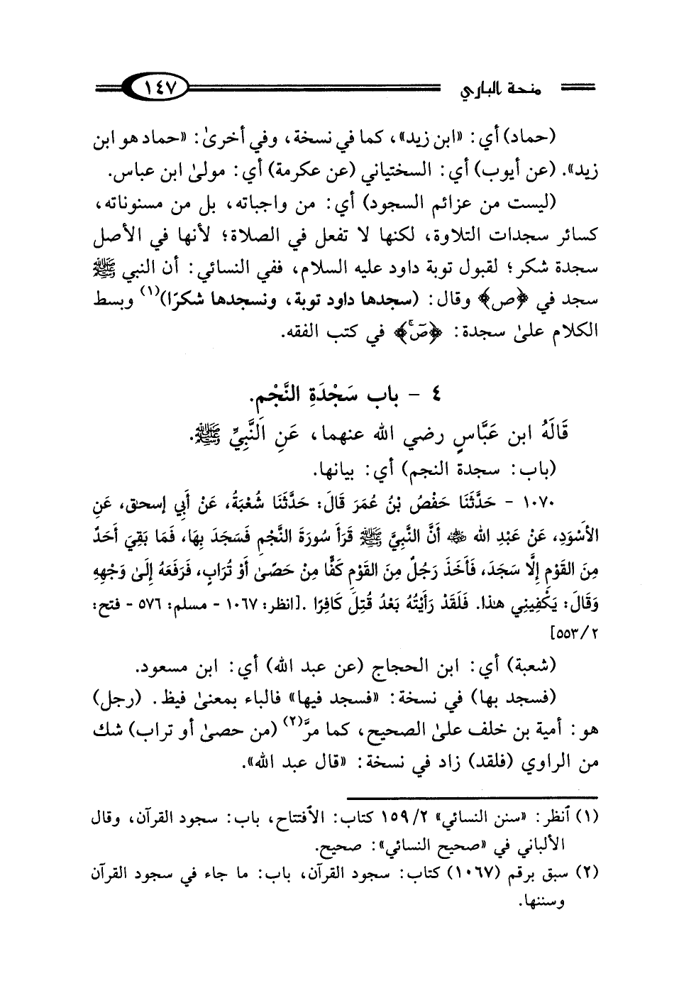 (ليست من عزائم السجود) أي: من واجباته، بل من مسنوناته، كسائر سجدات التلاوة، لكنها لا تفعل في الصلاة؛ لأنها في الأصل سجدة شكر؛ لقبول توبة داود - عليه السلام -، ففي النسائي: أن النبي - صلى الله عليه وسلم - سجد في {ص} وقال: (سجدها داود توبة، ونسجدها شكرًا) (¬1) وبسط الكلام على سجدة: {ص} في كتب الفقه.