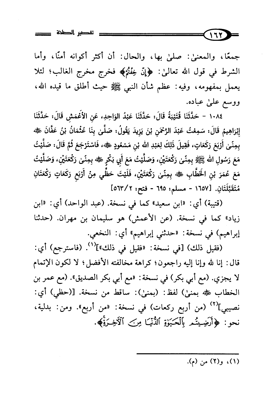 1084 - حَدَّثَنَا قُتَيْبَةُ بْنُ سَعِيدٍ، قَال: حَدَّثَنَا عَبْدُ الوَاحِدِ بْنُ زِيَادٍ، عَنِ الأَعْمَشِ، قَال: حَدَّثَنَا إِبْرَاهِيمُ، قَال: سَمِعْتُ عَبْدَ الرَّحْمَنِ بْنَ يَزِيدَ، يَقُولُ: صَلَّى بِنَا عُثْمَانُ بْنُ عَفَّانَ رَضِيَ اللَّهُ عَنْهُ بِمِنًى أَرْبَعَ رَكَعَاتٍ، فَقِيلَ: ذَلِكَ لِعَبْدِ اللَّهِ بْنِ مَسْعُودٍ رَضِيَ اللَّهُ عَنْهُ، فَاسْتَرْجَعَ، ثُمَّ قَال: "صَلَّيْتُ مَعَ رَسُولِ اللَّهِ صَلَّى اللهُ عَلَيْهِ وَسَلَّمَ بِمِنًى رَكْعَتَيْنِ، وَصَلَّيْتُ مَعَ أَبِي بَكْرٍ الصِّدِّيقِ رَضِيَ اللَّهُ عَنْهُ بِمِنًى رَكْعَتَيْنِ، وَصَلَّيْتُ مَعَ عُمَرَ بْنِ الخَطَّابِ رَضِيَ اللَّهُ عَنْهُ بِمِنًى رَكْعَتَيْنِ"، فَلَيْتَ حَظِّي مِنْ أَرْبَعِ رَكَعَاتٍ رَكْعَتَانِ مُتَقَبَّلَتَانِ.