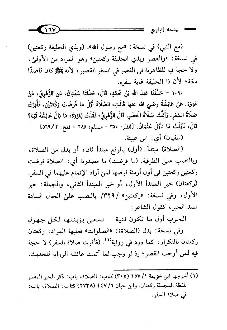 1090 - حَدَّثَنَا عَبْدُ اللَّهِ بْنُ مُحَمَّدٍ، قَال: حَدَّثَنَا سُفْيَانُ، عَنِ الزُّهْرِيِّ، عَنْ عُرْوَةَ، عَنْ عَائِشَةَ رَضِيَ اللَّهُ عَنْهَا، قَالتْ: "الصَّلاةُ أَوَّلُ مَا فُرِضَتْ رَكْعَتَيْنِ، فَأُقِرَّتْ صَلاةُ السَّفَرِ، وَأُتِمَّتْ صَلاةُ الحَضَرِ" قَال الزُّهْرِيُّ: فَقُلْتُ لِعُرْوَةَ: مَا بَالُ عَائِشَةَ تُتِمُّ؟ قَال: "تَأَوَّلَتْ مَا تَأَوَّلَ عُثْمَانُ".