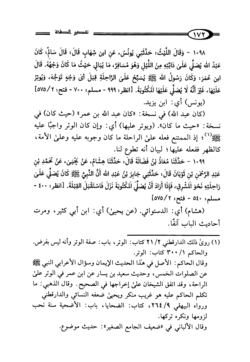 1098 - وَقَال اللَّيْثُ: حَدَّثَنِي يُونُسُ، عَنْ ابْنِ شِهَابٍ، قَال: قَال سَالِمٌ: "كَانَ عَبْدُ اللَّهِ بْنُ عُمَرَ رَضِيَ اللَّهُ عَنْهُمَا يُصَلِّي عَلَى دَابَّتِهِ مِنَ اللَّيْلِ، وَهُوَ مُسَافِرٌ مَا يُبَالِي حَيْثُ مَا كَانَ وَجْهُهُ" قَال ابْنُ عُمَرَ: "وَكَانَ رَسُولُ اللَّهِ صَلَّى اللهُ عَلَيْهِ وَسَلَّمَ يُسَبِّحُ عَلَى الرَّاحِلَةِ قِبَلَ أَيِّ وَجْهٍ تَوَجَّهَ، وَيُوتِرُ عَلَيْهَا، غَيْرَ أَنَّهُ لَا يُصَلِّي عَلَيْهَا المَكْتُوبَةَ".