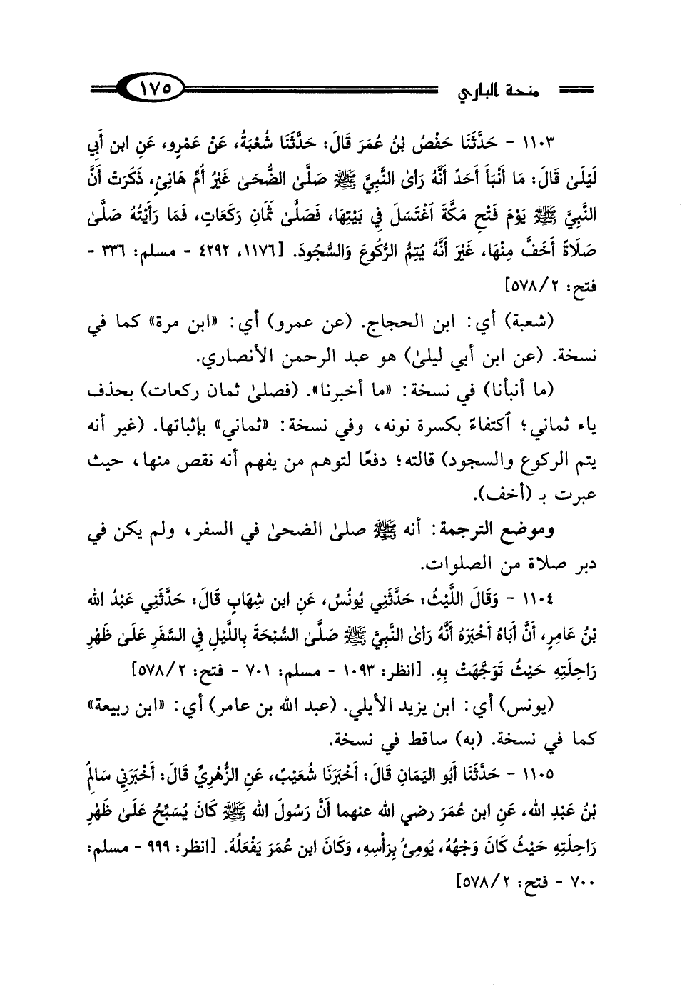 1103 - حَدَّثَنَا حَفْصُ بْنُ عُمَرَ، قَال: حَدَّثَنَا شُعْبَةُ، عَنْ عَمْرِو بْنِ مُرَّةَ، عَنِ ابْنِ أَبِي لَيْلَى، قَال: مَا أَخْبَرَنَا أَحَدٌ، أَنَّهُ رَأَى النَّبِيَّ صَلَّى اللهُ عَلَيْهِ وَسَلَّمَ صَلَّى الضُّحَى غَيْرُ أُمِّ هَانِئٍ ذَكَرَتْ: "أَنَّ النَّبِيَّ صَلَّى اللهُ عَلَيْهِ وَسَلَّمَ يَوْمَ فَتْحِ مَكَّةَ اغْتَسَلَ فِي بَيْتِهَا، فَصَلَّى ثَمَانِيَ رَكَعَاتٍ، فَمَا رَأَيْتُهُ صَلَّى صَلاةً أَخَفَّ مِنْهَا غَيْرَ أَنَّهُ يُتِمُّ الرُّكُوعَ وَالسُّجُودَ".