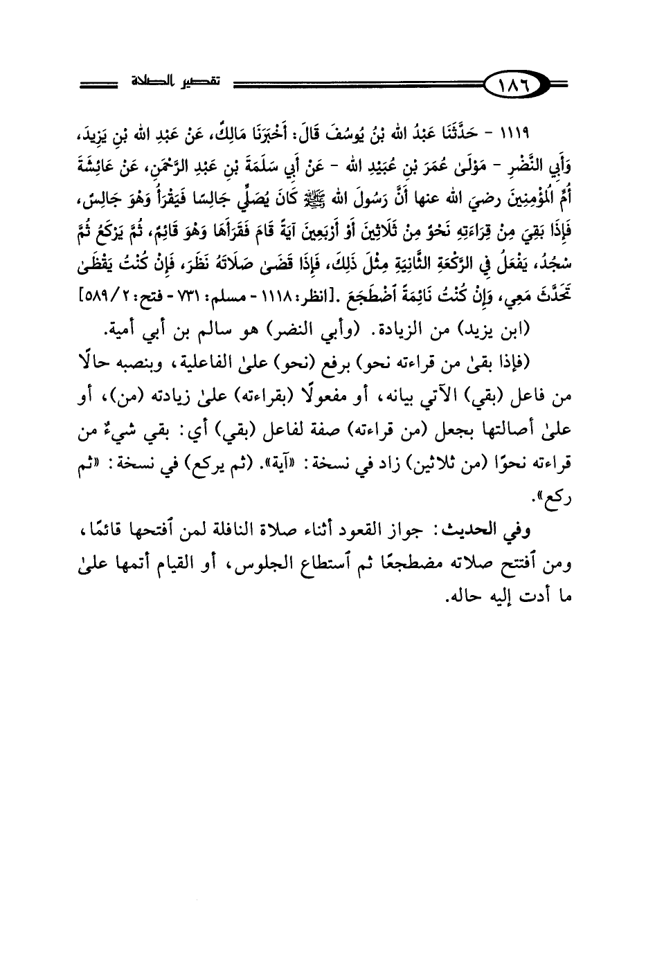 1119 - حَدَّثَنَا عَبْدُ اللَّهِ بْنُ يُوسُفَ، قَال: أَخْبَرَنَا مَالِكٌ، عَنْ عَبْدِ اللَّهِ بْنِ يَزِيدَ، وَأَبِي النَّضْرِ مَوْلَى عُمَرَ بْنِ عُبَيْدِ اللَّهِ، عَنْ أَبِي سَلَمَةَ بْنِ عَبْدِ الرَّحْمَنِ، عَنْ عَائِشَةَ أُمِّ المُؤْمِنِينَ رَضِيَ اللَّهُ عَنْهَا: "أَنَّ رَسُولَ اللَّهِ صَلَّى اللهُ عَلَيْهِ وَسَلَّمَ كَانَ يُصَلِّي جَالِسًا، فَيَقْرَأُ وَهُوَ جَالِسٌ، فَإِذَا بَقِيَ مِنْ قِرَاءَتِهِ نَحْوٌ مِنْ ثَلاثِينَ - أَوْ أَرْبَعِينَ - آيَةً قَامَ فَقَرَأَهَا وَهُوَ قَائِمٌ، ثُمَّ يَرْكَعُ، ثُمَّ سَجَدَ يَفْعَلُ فِي الرَّكْعَةِ الثَّانِيَةِ مِثْلَ ذَلِكَ، فَإِذَا قَضَى صَلاتَهُ نَظَرَ: فَإِنْ كُنْتُ يَقْظَى تَحَدَّثَ مَعِي، وَإِنْ كُنْتُ نَائِمَةً اضْطَجَعَ".