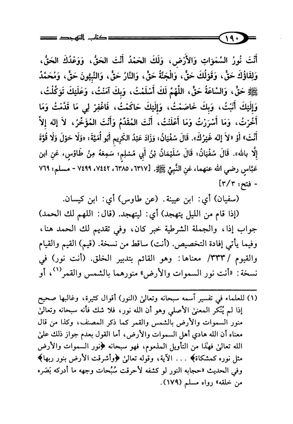 لَكَ مُلْكُ السَّمَوَاتِ وَالأَرْضِ وَمَنْ فِيهِنَّ، وَلَكَ الحَمْدُ أَنْتَ نُورُ السَّمَوَاتِ وَالأَرْضِ وَمَنْ فِيهِنَّ، وَلَكَ الحَمْدُ أَنْتَ مَلِكُ السَّمَوَاتِ وَالأَرْضِ، وَلَكَ الحَمْدُ أَنْتَ الحَقُّ وَوَعْدُكَ الحَقُّ، وَلِقَاؤُكَ حَقٌّ، وَقَوْلُكَ حَقٌّ، وَالجَنَّةُ حَقٌّ، وَالنَّارُ حَقٌّ، وَالنَّبِيُّونَ حَقٌّ، وَمُحَمَّدٌ صَلَّى اللهُ عَلَيْهِ وَسَلَّمَ حَقٌّ، وَالسَّاعَةُ حَقٌّ، اللَّهُمَّ لَكَ أَسْلَمْتُ، وَبِكَ آمَنْتُ، وَعَلَيْكَ تَوَكَّلْتُ، وَإِلَيْكَ أَنَبْتُ، وَبِكَ خَاصَمْتُ، وَإِلَيْكَ حَاكَمْتُ، فَاغْفِرْ لِي مَا قَدَّمْتُ وَمَا أَخَّرْتُ، وَمَا أَسْرَرْتُ وَمَا أَعْلَنْتُ، أَنْتَ المُقَدِّمُ، وَأَنْتَ المُؤَخِّرُ، لَا إِلَهَ إلا أَنْتَ - أَوْ: لَا إِلَهَ غَيْرُكَ - " قَال سُفْيَانُ: وَزَادَ عَبْدُ الكَرِيمِ أَبُو أُمَيَّةَ: "وَلَا حَوْلَ وَلَا قُوَّةَ إلا بِاللَّهِ"، قَال سُفْيَانُ: قَال سُلَيْمَانُ بْنُ أَبِي مُسْلِمٍ: سَمِعَهُ مِنْ طَاوُسٍ، عَنْ ابْنِ عَبَّاسٍ رَضِيَ اللَّهُ عَنْهُمَا، عَنِ النَّبِيِّ صَلَّى اللهُ عَلَيْهِ وَسَلَّمَ.