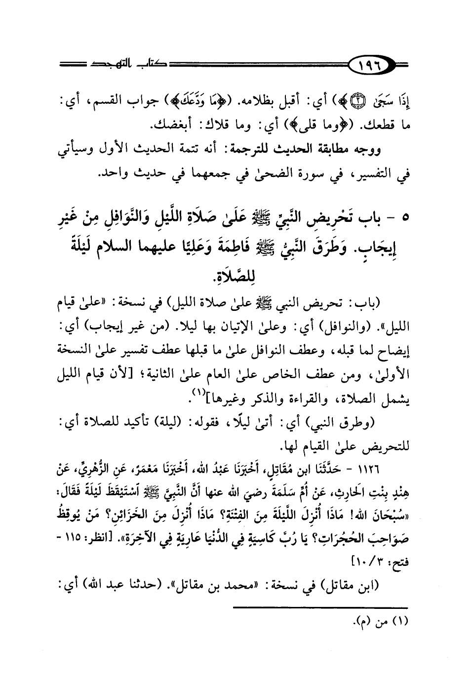5 - بَابُ تَحْرِيضِ النَّبِيِّ صَلَّى اللهُ عَلَيْهِ وَسَلَّمَ عَلَى صَلاةِ اللَّيْلِ وَالنَّوَافِلِ مِنْ غَيْرِ إِيجَابٍ