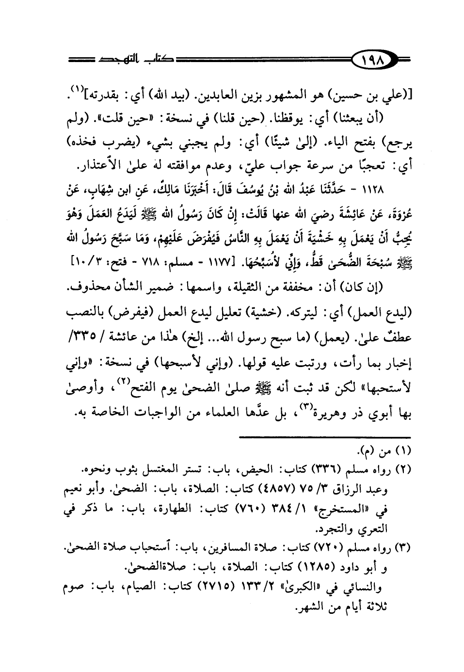1128 - حَدَّثَنَا عَبْدُ اللَّهِ بْنُ يُوسُفَ، قَال: أَخْبَرَنَا مَالِكٌ، عَنِ ابْنِ شِهَابٍ، عَنْ عُرْوَةَ، عَنْ عَائِشَةَ رَضِيَ اللَّهُ عَنْهَا، قَالتْ: "إِنْ كَانَ رَسُولُ اللَّهِ صَلَّى اللهُ عَلَيْهِ وَسَلَّمَ لَيَدَعُ العَمَلَ، وَهُوَ يُحِبُّ أَنْ يَعْمَلَ بِهِ خَشْيَةَ أَنْ يَعْمَلَ بِهِ النَّاسُ، فَيُفْرَضَ عَلَيْهِمْ، وَمَا سَبَّحَ رَسُولُ اللَّهِ صَلَّى اللهُ عَلَيْهِ وَسَلَّمَ سُبْحَةَ الضُّحَى قَطُّ وَإِنِّي لَأُسَبِّحُهَا".