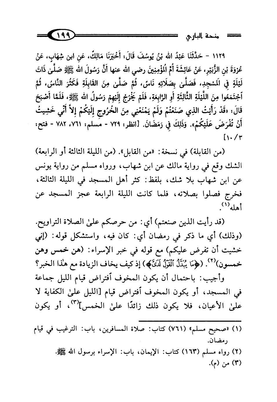 1129 - حَدَّثَنَا عَبْدُ اللَّهِ بْنُ يُوسُفَ، قَال: أَخْبَرَنَا مَالِكٌ، عَنِ ابْنِ شِهَابٍ، عَنْ عُرْوَةَ بْنِ الزُّبَيْرِ، عَنْ عَائِشَةَ أُمِّ المُؤْمِنِينَ رَضِيَ اللَّهُ عَنْهَا: أَنَّ رَسُولَ اللَّهِ صَلَّى اللهُ عَلَيْهِ وَسَلَّمَ صَلَّى ذَاتَ لَيْلَةٍ فِي المَسْجِدِ، فَصَلَّى بِصَلاتِهِ نَاسٌ، ثُمَّ صَلَّى مِنَ القَابِلَةِ، فَكَثُرَ النَّاسُ، ثُمَّ اجْتَمَعُوا مِنَ اللَّيْلَةِ الثَّالِثَةِ أَو الرَّابِعَةِ، فَلَمْ يَخْرُجْ إِلَيْهِمْ رَسُولُ اللَّهِ صَلَّى اللهُ عَلَيْهِ وَسَلَّمَ، فَلَمَّا أَصْبَحَ قَال: "قَدْ رَأَيْتُ الَّذِي صَنَعْتُمْ وَلَمْ يَمْنَعْنِي مِنَ الخُرُوجِ إِلَيْكُمْ إلا أَنِّي خَشِيتُ أَنْ تُفْرَضَ عَلَيْكُمْ وَذَلِكَ فِي رَمَضَانَ".