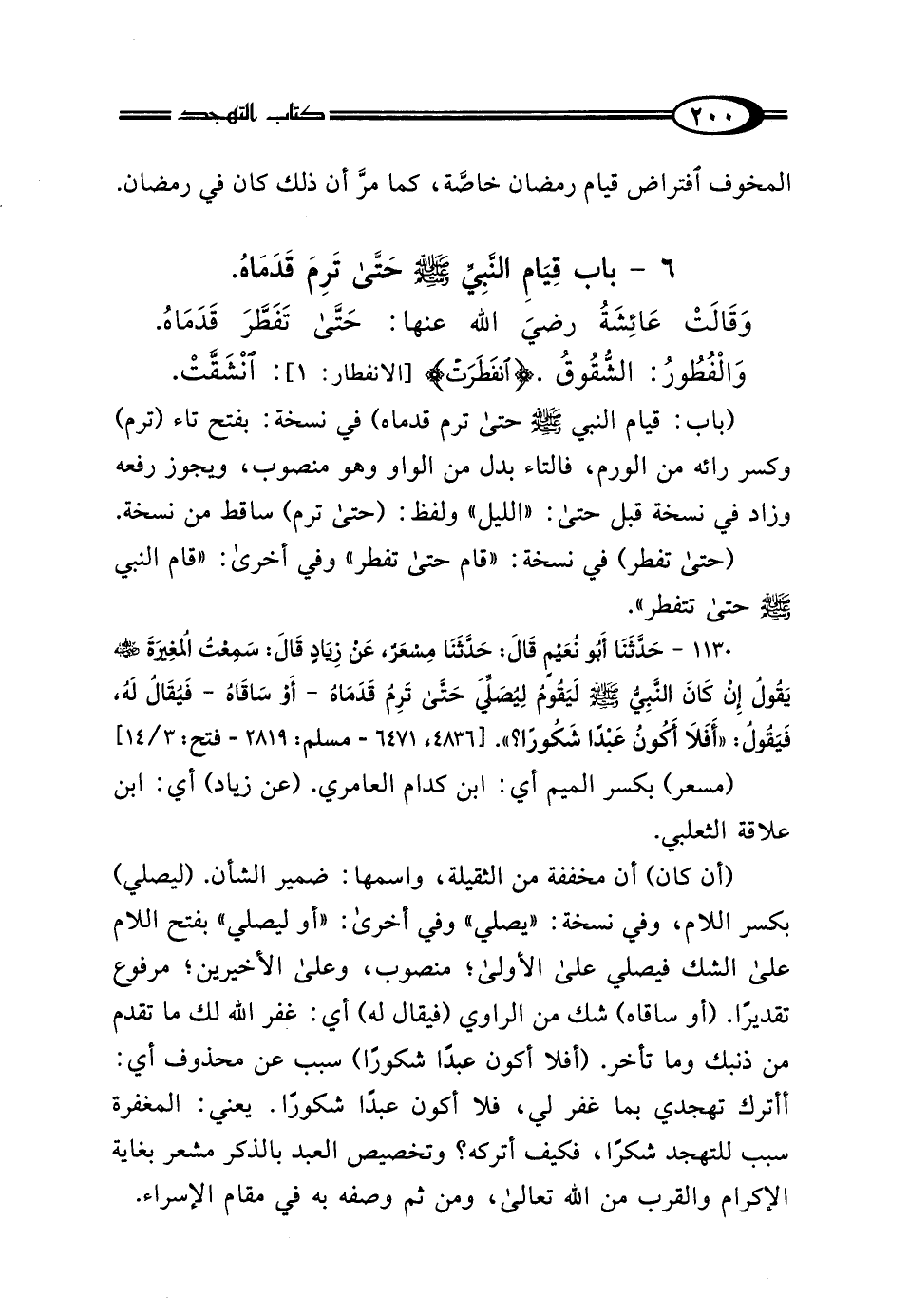 1130 - حَدَّثَنَا أَبُو نُعَيْمٍ، قَال: حَدَّثَنَا مِسْعَرٌ، عَنْ زِيَادٍ، قَال: سَمِعْتُ المُغِيرَةَ رَضِيَ اللَّهُ عَنْهُ، يَقُولُ: إِنْ كَانَ النَّبِيُّ صَلَّى اللهُ عَلَيْهِ وَسَلَّمَ لَيَقُومُ لِيُصَلِّيَ حَتَّى تَرِمُ قَدَمَاهُ - أَوْ سَاقَاهُ - فَيُقَالُ لَهُ فَيَقُولُ: "أَفَلا أَكُونُ عَبْدًا شَكُورًا".