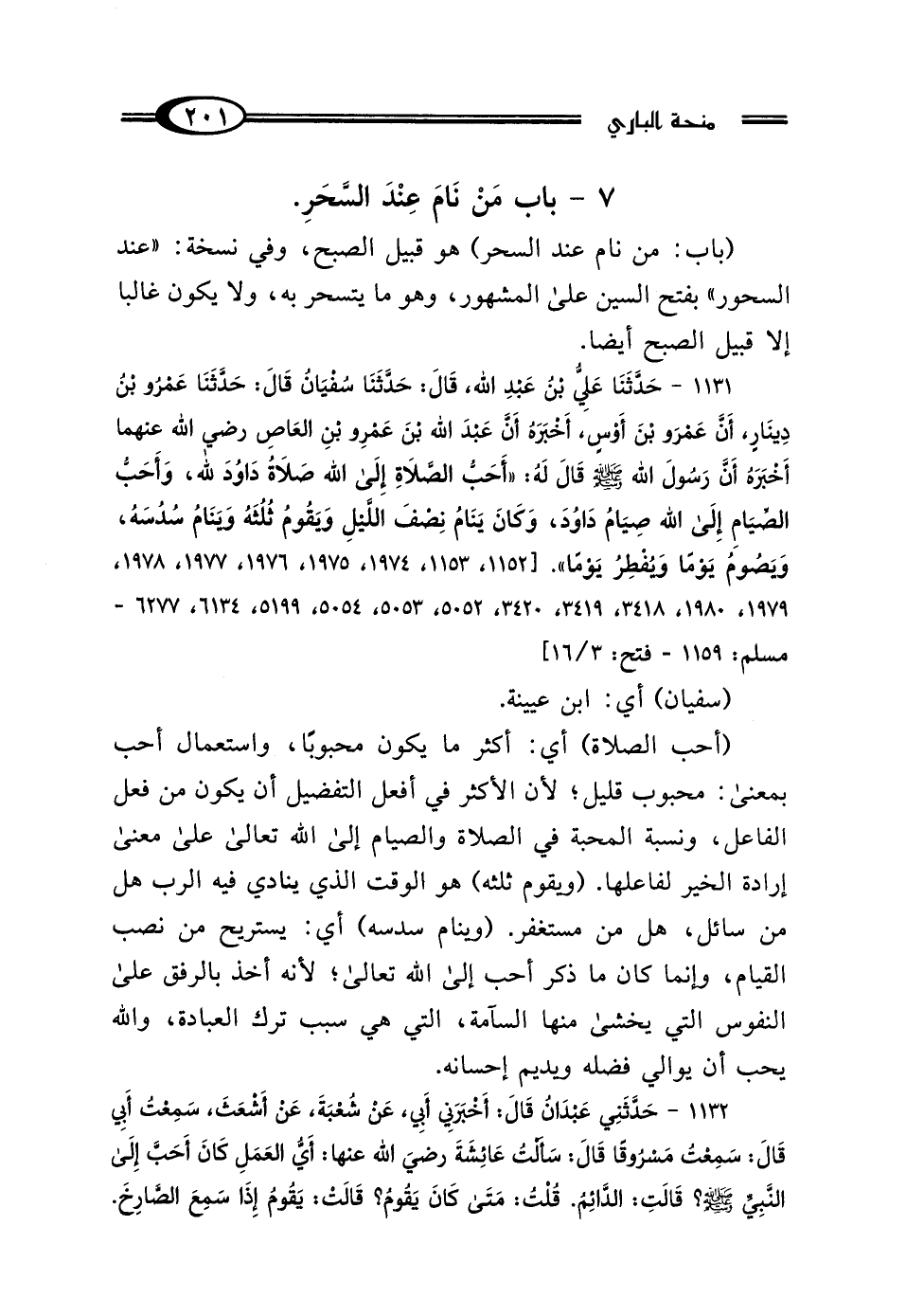 1131 - حَدَّثَنَا عَلِيُّ بْنُ عَبْدِ اللَّهِ، قَال: حَدَّثَنَا سُفْيَانُ، قَال: حَدَّثَنَا عَمْرُو بْنُ دِينَارٍ، أَنَّ عَمْرَو بْنَ أَوْسٍ، أَخْبَرَهُ: أَنَّ عَبْدَ اللَّهِ بْنَ عَمْرِو بْنِ العَاصِ رَضِيَ اللَّهُ عَنْهُمَا، أَخْبَرَهُ: أَنَّ رَسُولَ اللَّهِ صَلَّى اللهُ عَلَيْهِ وَسَلَّمَ قَال لَهُ: "أَحَبُّ الصَّلاةِ إِلَى اللَّهِ صَلاةُ دَاوُدَ عَلَيْهِ السَّلامُ، وَأَحَبُّ الصِّيَامِ إِلَى اللَّهِ صِيَامُ دَاوُدَ، وَكَانَ يَنَامُ نِصْفَ اللَّيْلِ وَيَقُومُ ثُلُثَهُ، وَيَنَامُ سُدُسَهُ، وَيَصُومُ يَوْمًا، وَيُفْطِرُ يَوْمًا".