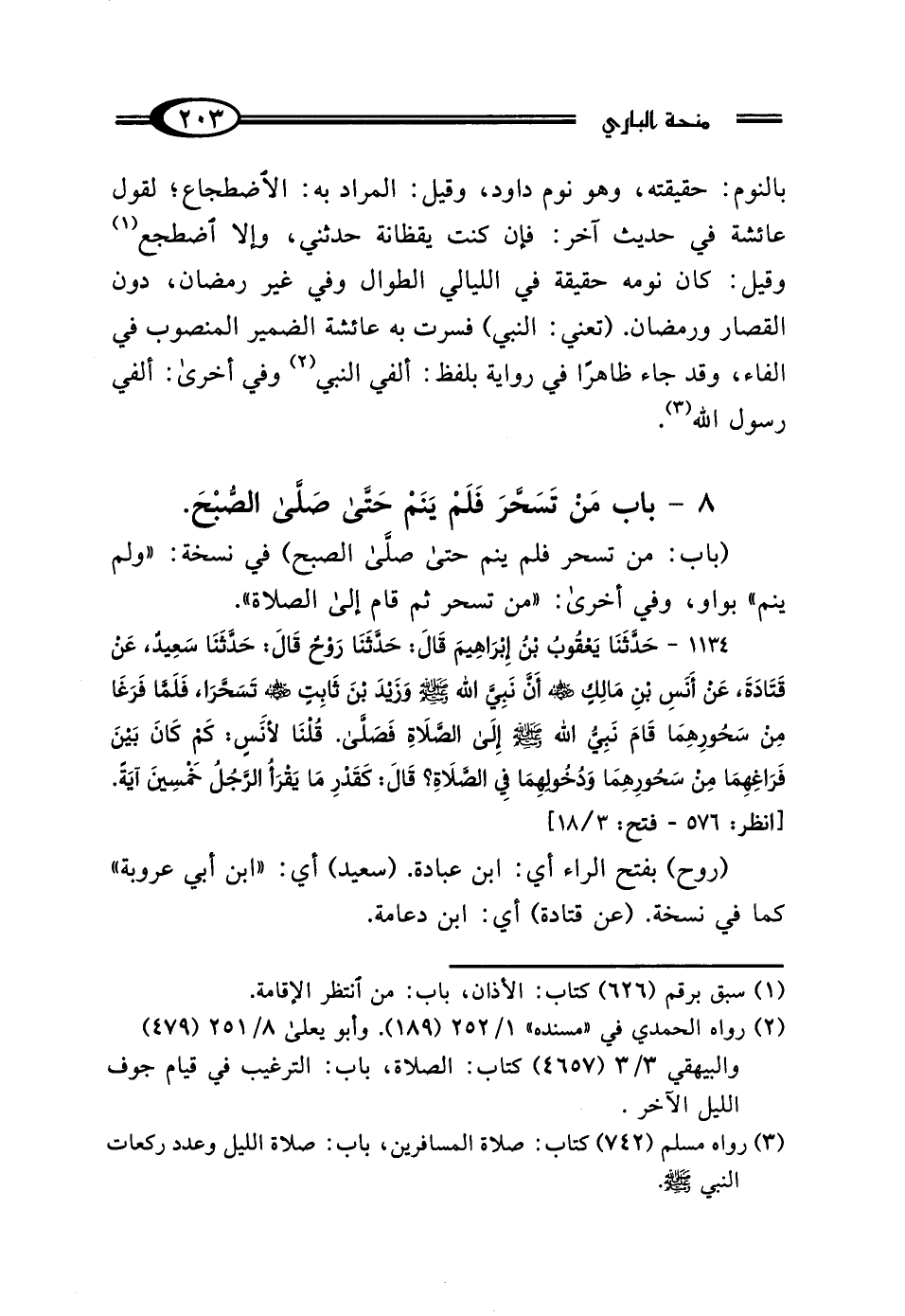 1134 - حَدَّثَنَا يَعْقُوبُ بْنُ إِبْرَاهِيمَ، قَال: حَدَّثَنَا رَوْحٌ، قَال: حَدَّثَنَا سَعِيدُ بْنُ أَبِي عَرُوبَةَ، عَنْ قَتَادَةَ، عَنْ أَنَسِ بْنِ مَالِكٍ رَضِيَ اللَّهُ عَنْهُ، "أَنَّ نَبِيَّ اللَّهِ صَلَّى اللهُ عَلَيْهِ وَسَلَّمَ وَزَيْدَ بْنَ ثَابِتٍ رَضِيَ اللَّهُ عَنْهُ تَسَحَّرَا، فَلَمَّا فَرَغَا مِنْ سَحُورِهِمَا، قَامَ نَبِيُّ اللَّهِ صَلَّى اللهُ عَلَيْهِ وَسَلَّمَ إِلَى الصَّلاةِ، فَصَلَّى"، فَقُلْنَا لِأَنَسٍ: كَمْ كَانَ بَيْنَ فَرَاغِهِمَا مِنْ سَحُورِهِمَا وَدُخُولِهِمَا فِي الصَّلاةِ؟ قَال: كَقَدْرِ مَا يَقْرَأُ الرَّجُلُ خَمْسِينَ آيَةً.