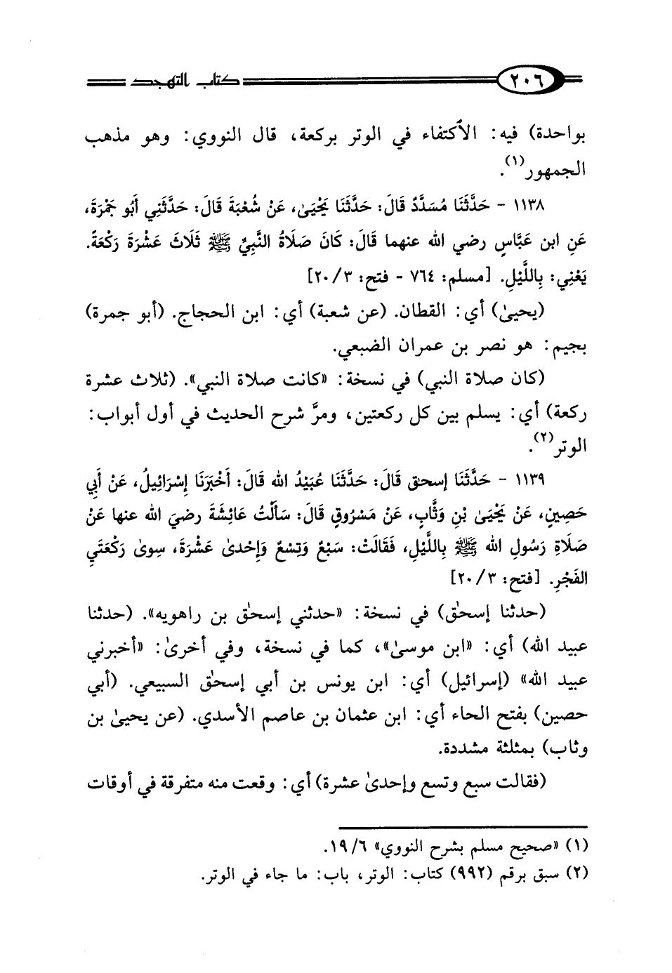 1138 - حَدَّثَنَا مُسَدَّدٌ، قَال: حَدَّثَنَا يَحْيَى، عَنْ شُعْبَةَ، قَال: حَدَّثَنِي أَبُو جَمْرَةَ، عَنِ ابْنِ عَبَّاسٍ رَضِيَ اللَّهُ عَنْهُمَا، قَال: "كَانَتْ صَلاةُ النَّبِيِّ صَلَّى اللهُ عَلَيْهِ وَسَلَّمَ ثَلاثَ عَشْرَةَ رَكْعَةً" يَعْنِي بِاللَّيْلِ.