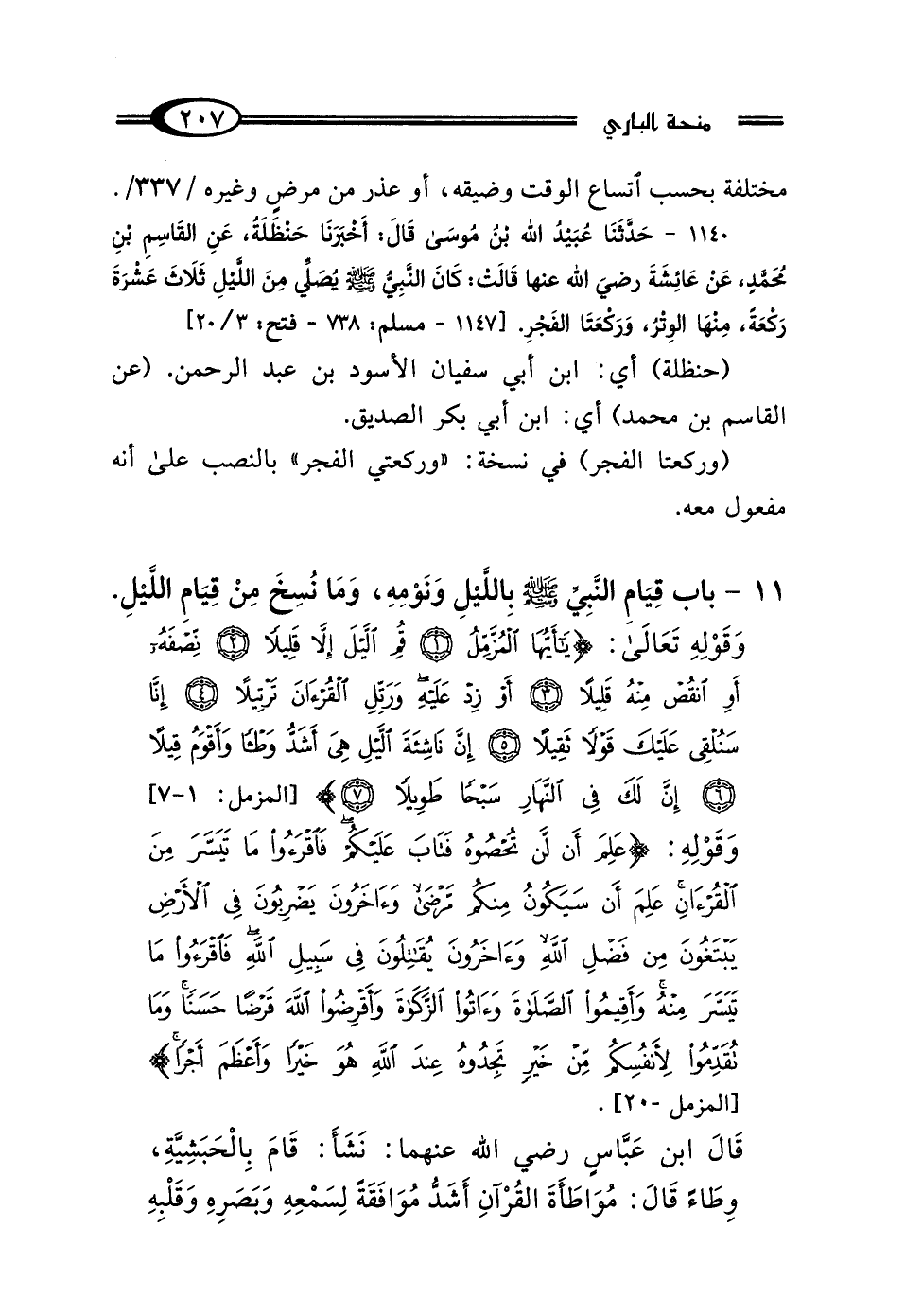 1140 - حَدَّثَنَا عُبَيْدُ اللَّهِ بْنُ مُوسَى، قَالَ: أَخْبَرَنَا حَنْظَلَةُ، عَنِ القَاسِمِ بْنِ مُحَمَّدٍ، عَنْ عَائِشَةَ رَضِيَ اللَّهُ عَنْهَا، قَالَتْ: «كَانَ النَّبِيُّ صَلَّى اللهُ عَلَيْهِ وَسَلَّمَ يُصَلِّي مِنَ اللَّيْلِ ثَلاَثَ عَشْرَةَ رَكْعَةً مِنْهَا الوِتْرُ، وَرَكْعَتَا الفَجْرِ» [1147 - مسلم: 738 - فتح: 3/ 20]
