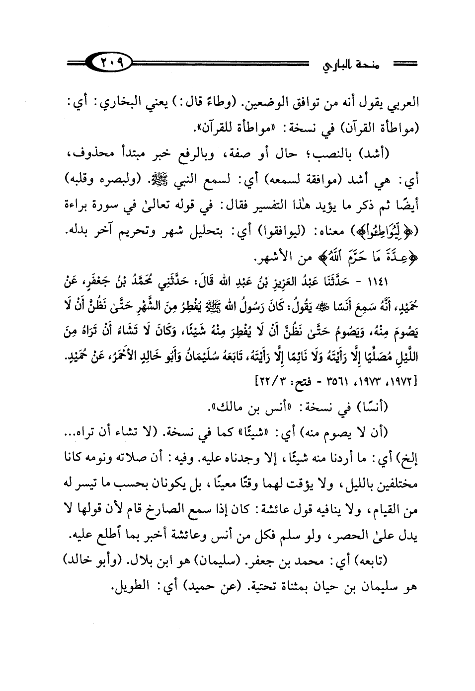 1141 - حَدَّثَنَا عَبْدُ العَزِيزِ بْنُ عَبْدِ اللَّهِ، قَال: حَدَّثَنِي مُحَمَّدُ بْنُ جَعْفَرٍ، عَنْ حُمَيْدٍ، أَنَّهُ سَمِعَ أَنَسَ بْنَ مَالِكٍ رَضِيَ اللَّهُ عَنْهُ، يَقُولُ: "كَانَ رَسُولُ اللَّهِ صَلَّى اللهُ عَلَيْهِ وَسَلَّمَ يُفْطِرُ مِنَ الشَّهْرِ حَتَّى نَظُنَّ أَنْ لَا يَصُومَ مِنْهُ، وَيَصُومُ حَتَّى نَظُنَّ أَنْ لَا يُفْطِرَ مِنْهُ شَيْئًا، وَكَانَ لَا تَشَاءُ أَنْ تَرَاهُ مِنَ اللَّيْلِ مُصَلِّيًا إلا رَأَيْتَهُ، وَلَا نَائِمًا إلا رَأَيْتَهُ" تَابَعَهُ سُلَيْمَانُ، وَأَبُو خَالِدٍ الأَحْمَرُ، عَنْ حُمَيْدٍ.