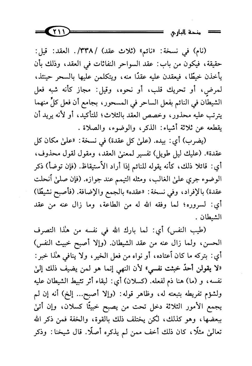 (طيب النفس) أي: لما بارك اللَّه في نفسه من هذا التصرف الحسن، ولما زال عنه من عقد الشيطان. (وإلا أصبح خبيث النفس) أي: بتركه ما كان اعتاده، أو نواه من فعل الخير، ولا ينافي هذا خبر: "لا يقولن أحدٌ خبثت نفسي" لأن النهي إنما هو لمن يضيف ذلك إيا نفسه، و (ما) هنا ذم لفعله. (كسلان) أي: لبقاء أثر تثبيط الشيطان عليه ولشؤم تفريطه بتبعته له، وظاهر قوله: (وإلا أصبح ... إلخ) أنه إن لم يجمع الأمور الثلاثة دخل تحت من يصبح خبيثًا كسلان، وإن أتى ببعضها، وهو كذلك، لكن يختلف ذلك بالقوة، والخفة فمن ذكر اللَّه تعالى مثلًا، كان ذلك أخف ممن لم يذكره أصلًا. قال شيخنا: وذكر