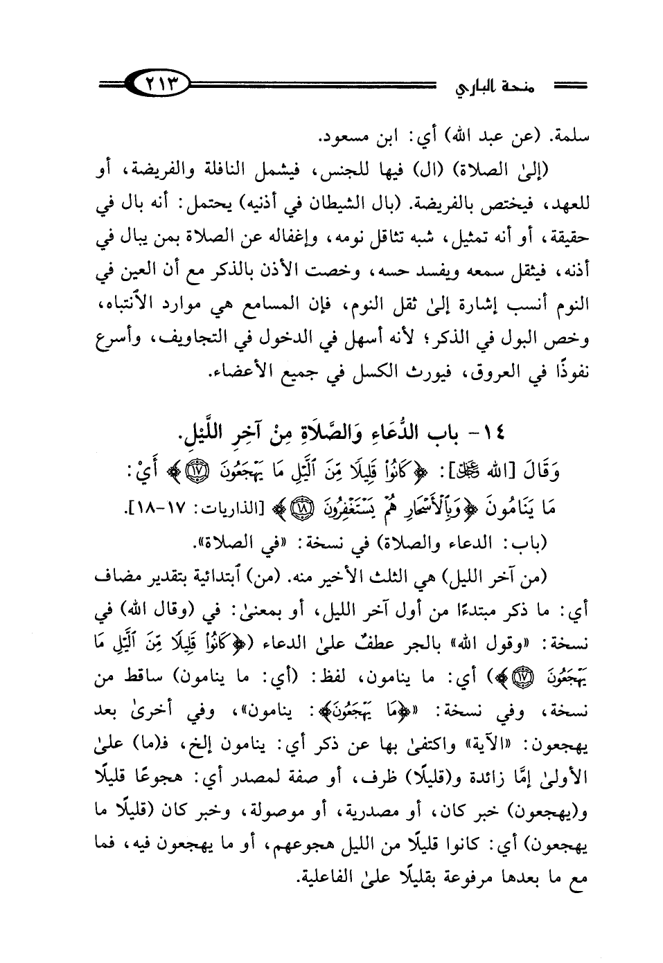 (من آخر الليل) هي الثلث الأخير منه. (من) ابتدائية بتقدير مضاف أي: ما ذكر مبتدءًا من أول آخر الليل، أو بمعنى: في (وقال اللَّه) في نسخة: "وقول اللَّه" بالجر عطفٌ على الدعاء ({كَانُوا قَلِيلًا مِنَ اللَّيْلِ مَا يَهْجَعُونَ (17)}) أي: ما ينامون، لفظ: (أي: ما ينامون) ساقط من نسخة، وفي نسخة: " {مَا يَهْجَعُونَ}: ينامون"، وفي أخرى بعد يهجعون: "الآية" واكتفى بها عن ذكر أي: ينامون إلخ، فـ (ما) على الأولى إمَّا زائدة و (قليلًا) ظرف، أو صفة لمصدر أي: هجوعًا قليلًا و (يهجعون) خبر كان، أو مصدرية، أو موصولة، وخبر كان (قليلًا ما يهجعون) أي: كانوا قليلًا من الليل هجوعهم، أو ما يهجعون فيه، فما مع ما بعدها مرفوعة بقليلًا على الفاعلية.