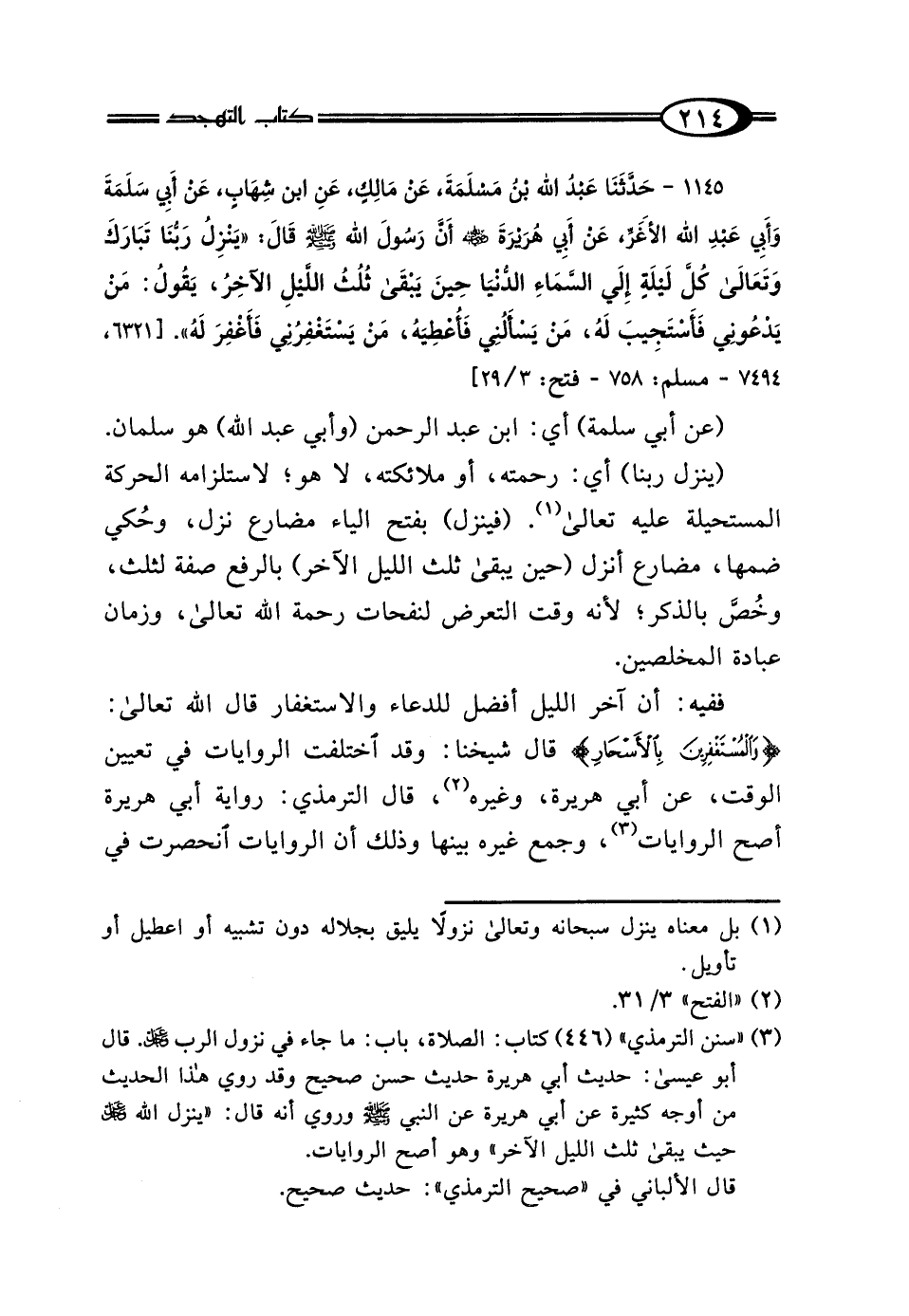 (¬3) "سنن الترمذي" (446) كتاب: الصلاة، باب: ما جاء في نزول الرب عزَّ وجلَّ. قال أبو عيسى: حديث أبي هريرة حديث حسن صحيح وقد روي هذا الحديث من أوجه كثيرة عن أبي هريرة عن النبي - صلى الله عليه وسلم - وروي أنه قال: "ينزل اللَّه عزَّ وجلَّ حيث يبقى ثلث الليل الآخر" وهو أصح الروايات.