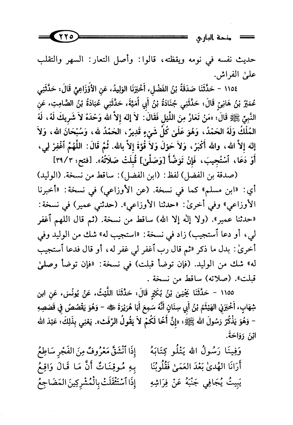 1154 - حَدَّثَنَا صَدَقَةُ بْنُ الفَضْلِ، أَخْبَرَنَا الوَلِيدُ هُوَ ابْنُ مُسْلِمٍ، حَدَّثَنَا الأَوْزَاعِيُّ، قَال: حَدَّثَنِي عُمَيْرُ بْنُ هَانِئٍ، قَال: حَدَّثَنِي جُنَادَةُ بْنُ أَبِي أُمَيَّةَ، حَدَّثَنِي عُبَادَةُ بْنُ الصَّامِتِ، عَنِ النَّبِيِّ صَلَّى اللهُ عَلَيْهِ وَسَلَّمَ قَال: "مَنْ تَعَارَّ مِنَ اللَّيْلِ، فَقَال: لَا إِلَهَ إلا اللَّهُ وَحْدَهُ لَا شَرِيكَ لَهُ، لَهُ المُلْكُ وَلَهُ الحَمْدُ، وَهُوَ عَلَى كُلِّ شَيْءٍ قَدِيرٌ، الحَمْدُ لِلَّهِ، وَسُبْحَانَ اللَّهِ، وَلَا إِلَهَ إلا اللَّهُ، وَاللَّهُ أَكْبَرُ، وَلَا حَوْلَ وَلَا قُوَّةَ إلا بِاللَّهِ، ثُمَّ قَال: اللَّهُمَّ اغْفِرْ لِي، أَوْ دَعَا، اسْتُجِيبَ لَهُ، فَإِنْ تَوَضَّأَ وَصَلَّى قُبِلَتْ صَلاتُهُ".